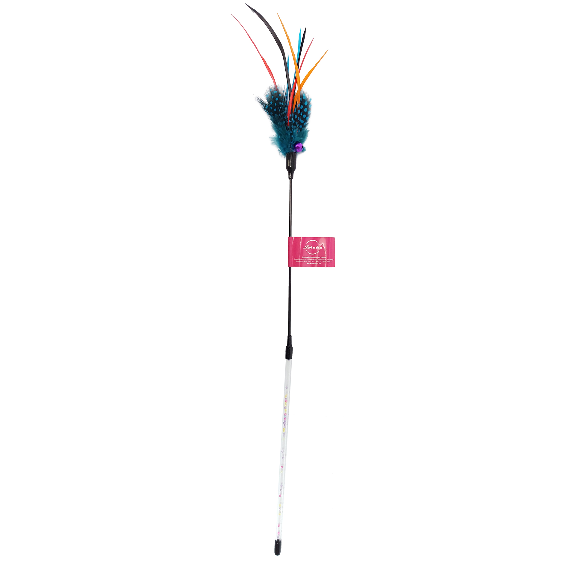 Eksoottinen kissan leikkihuiska värikkäillä luonnonhöyhenillä. 45 cm pitkässä varressa pyörivät värikkäät helmet, kun taas höyhenet ja pienet kellot kutsuvat kissaa leikkimään.