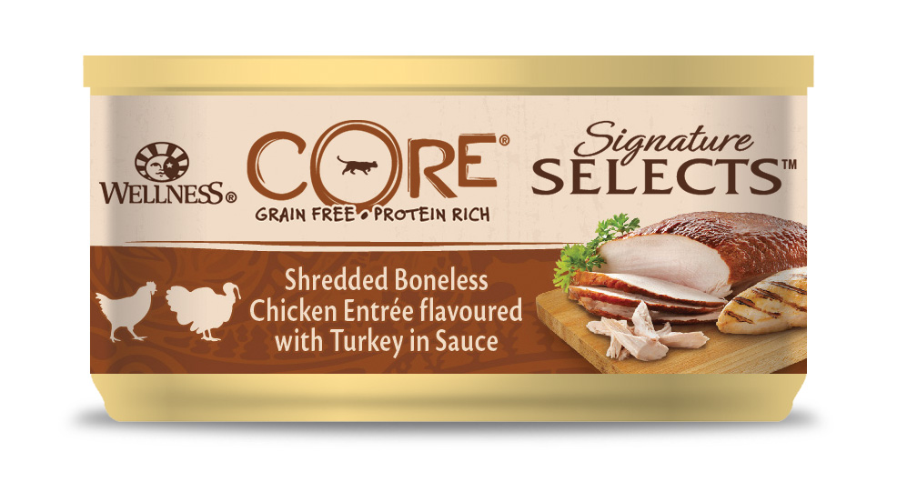 Wellness CORE Signature Selects Shredded Boneless Chicken Entrée with Turkey in Sauce on täysravinto ja tasapainoinen ateria, joka tarjoaa luonnollisesti proteiinia, makua ja rakennetta, joita lihansyöjäkissa kaipaa. Signature Selects -sarjan proteiinipitoinen resepti tekee ruokailuhetkistä maukkaita ja meheviä. Aito luuton, revitty kana houkuttelee kissasi nauttimaan reseptin herkullisesta mausta, vaihtelevista rakenteista ja täyteläisestä kastikkeesta.