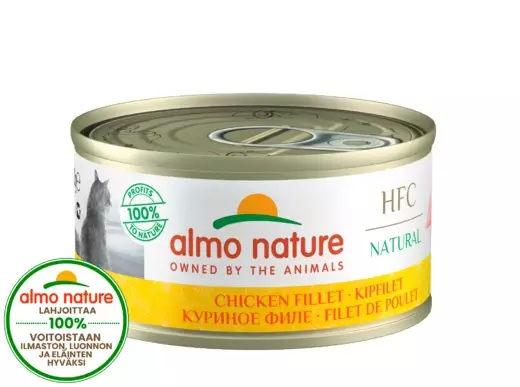 Almo Nature sisältää paljon tuoreita liha- ja kalapaloja (vähintään 60 %), jotka on alun perin tarkoitettu ihmisravinnoksi. Gluteeniton ruoka on kypsytetty varovasti omassa liemessään, jolloin sen sisältämät proteiinit ja hivenaineet säilyvät luonnollisella tavalla. Näin ruoassa on arvokas ravintoainekoostumus, joka vastaa kissasi fysiologisia tarpeita. Valmistusmenetelmä takaa lisäksi hyvän sulavuuden ja parhaan maittavuuden. Jopa erityisen vaativat tai herkät kissat voivat löytää lempiruokansa!