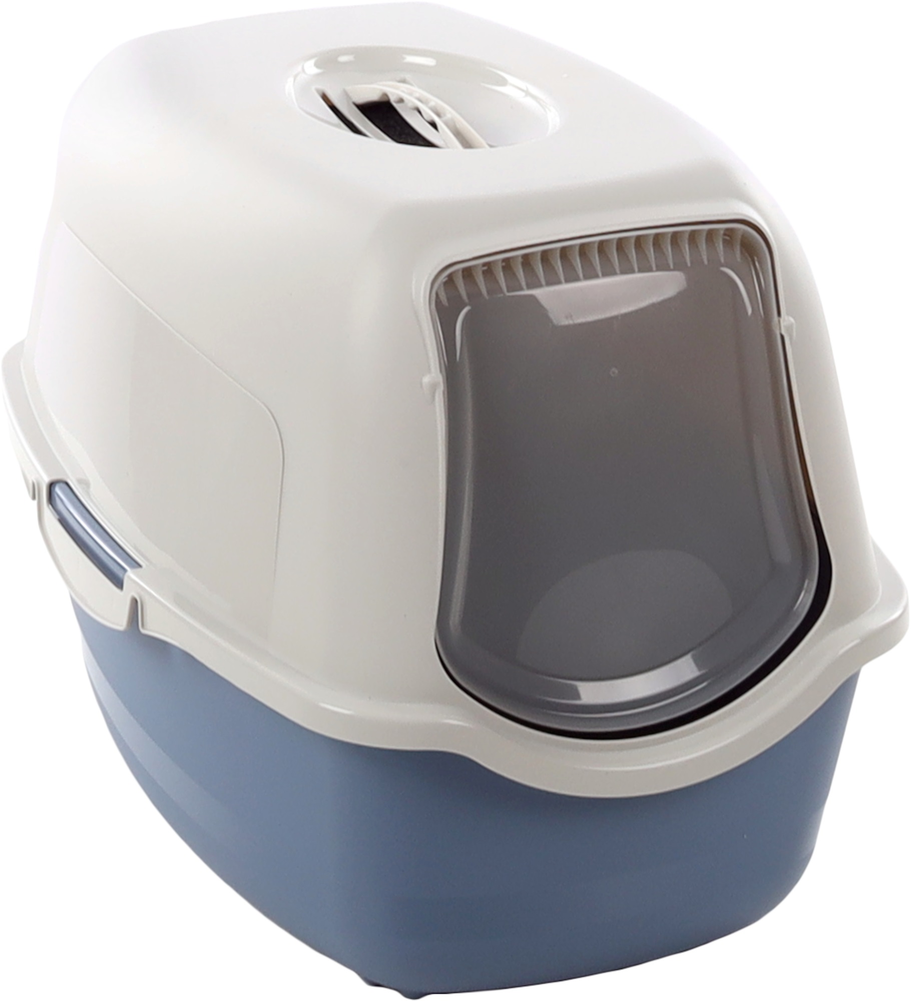 Kätevä katollinen hiekkalaatikko vähentää hiekan kuljeutumista. Mukana oleva aktiivihiilisuodatin vähentää hajuhaittoja.