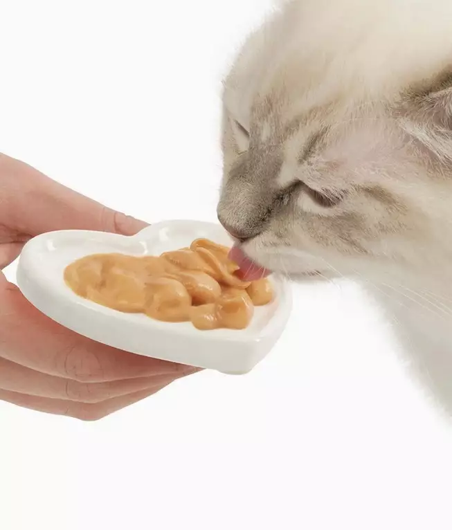 Pieni, keraaminen 'käsikuppi', jolla voit syöttää kissaasi käsin, tarjoamalla sille sydämen mallisesta lautaselta tahnamaisia herkkuja.