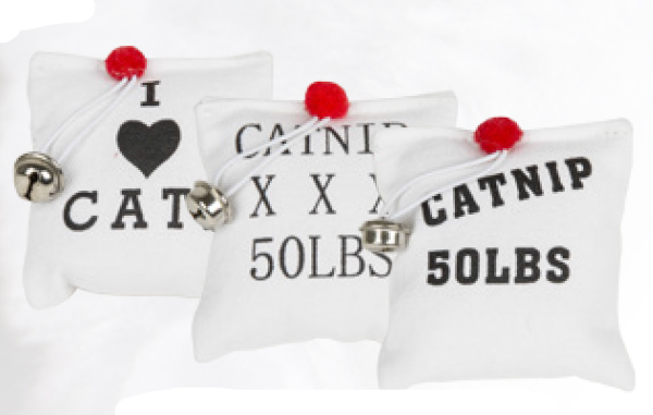 Hauska kissanmintulla täytetty pikkupussi kissan leikkaihin. Pussin on kiinnitetty naru jonka päässä on kulkunen. Pussin koko noin 8 cm, väri valkoinen. Teksti CATNIP 50 LBS.