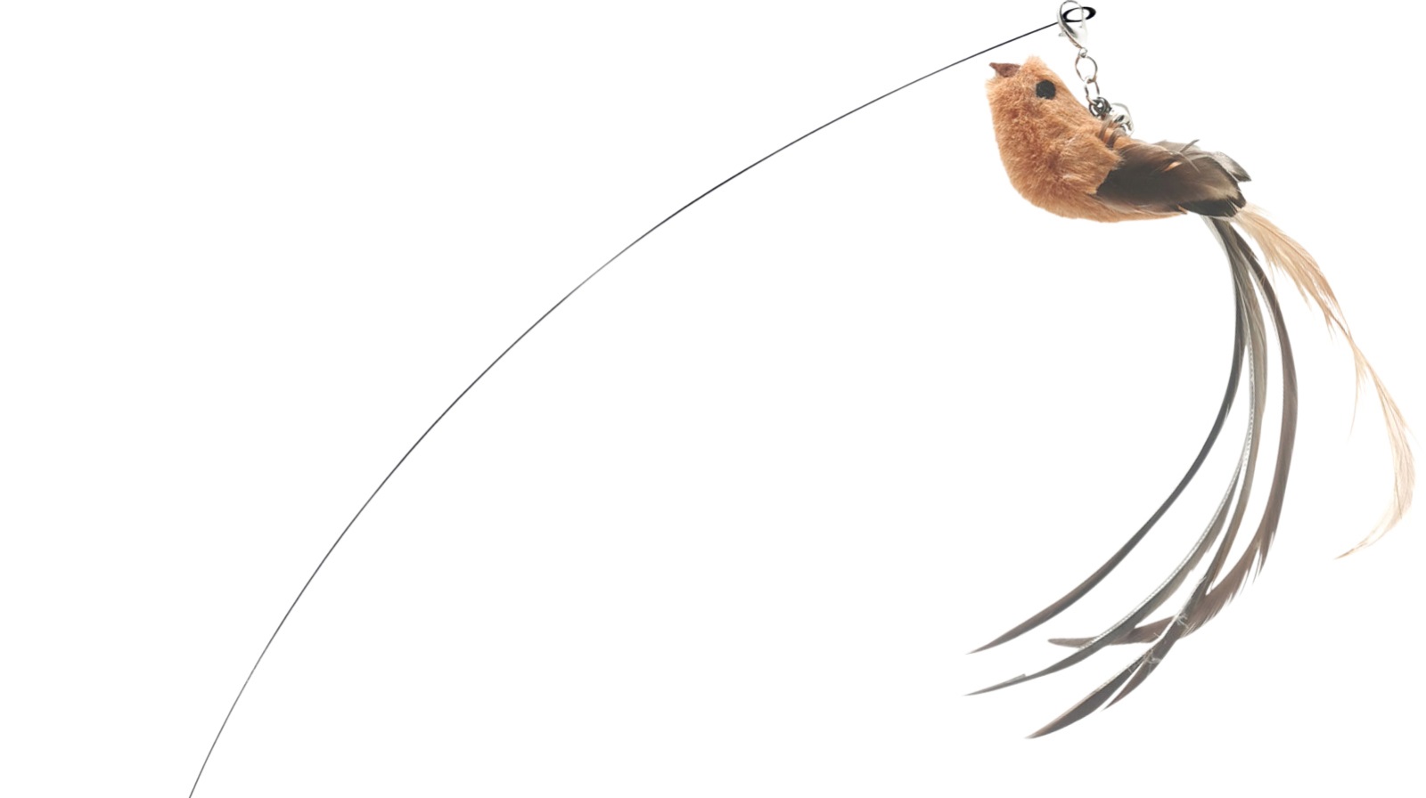 Kaksi erilaista kissanlelua pikalukoilla kiinnitettäväksi leikkionkeen tai huiskaan. Paketissa lintu sulilla ja karvainen puuhka.