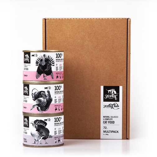 3cotyn kätevä monipakkaus sisältää 6 purkkia kolmea erilaista 180g kissan säilykeruokaa.