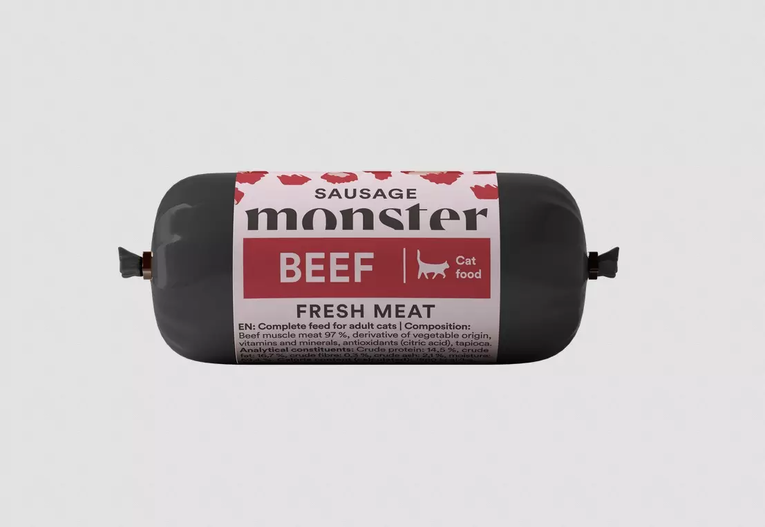 Onko kissasi joskus hieman nirso? Silloin lihaisa, viljaton ja hirviömäisen maistuva makkara voisi tehdä terää. Anna pääateriana tai kokeile raastettuna kuivamuonan päälle terveellisenä ruokahalun herättäjänä. Joten viipaloi ja kuutioi - ja miau, kiitos!