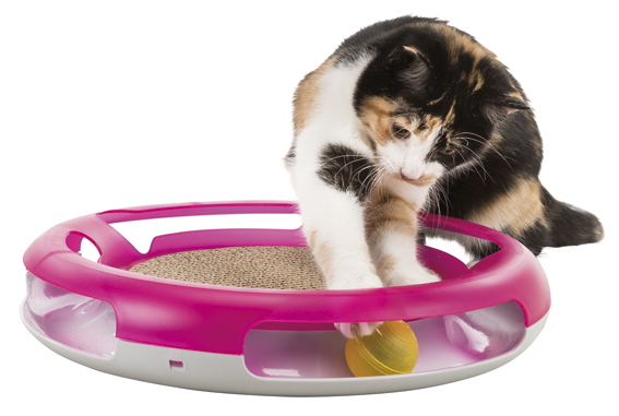 Hauska pallorata, täytettävällä kissanminttupallolla, yhdistettynä raapimapahviin.