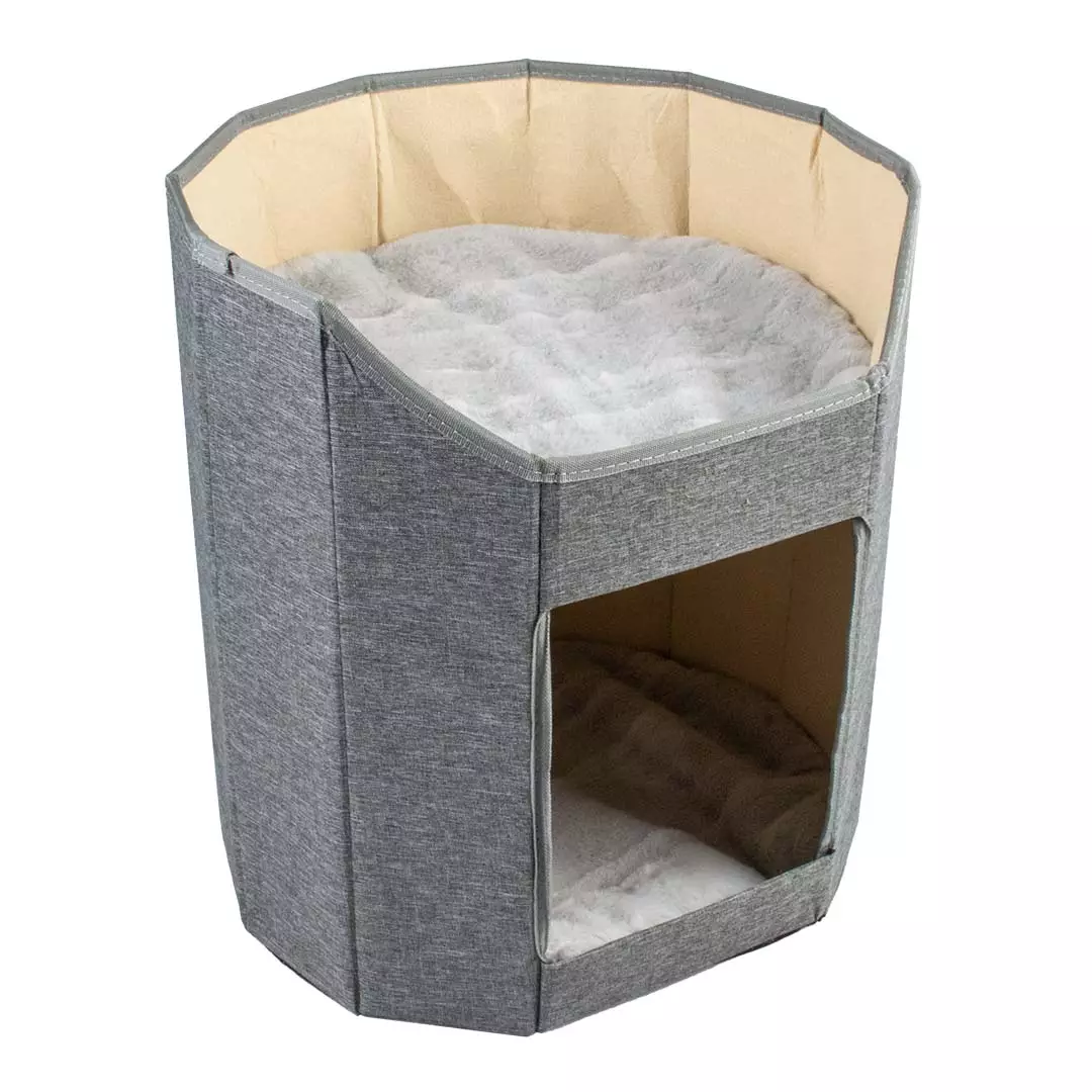 Kokoontaittuvassa kissatalossa on luolamainen pesäkolo ja tähystyspaikka ylhäällä, molemmissa pehmustetut tyynyt.