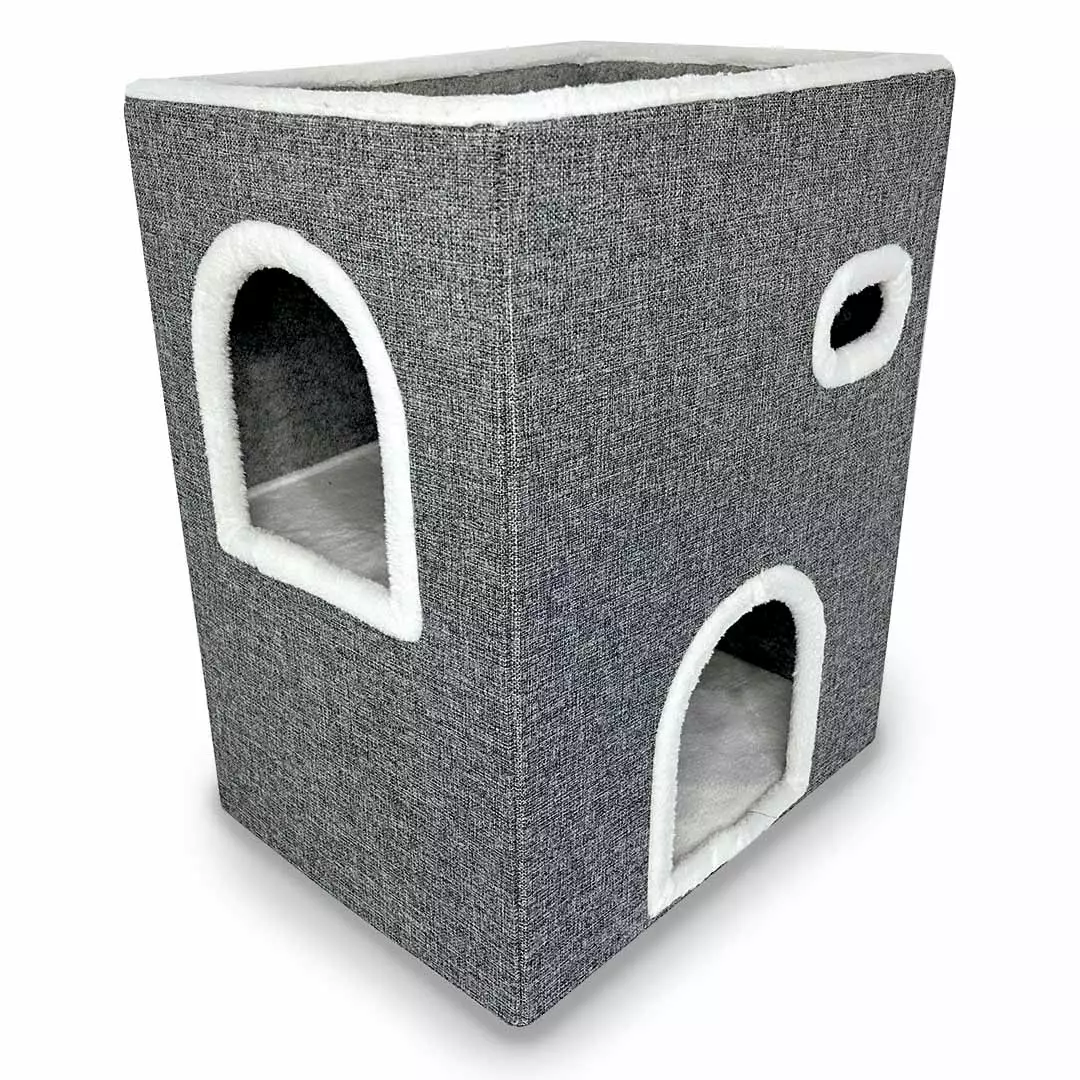 Kokoontaittuva, kaksikerroksinen kissan pesämökki, missä on useita aukkoja. Osa talosta on päällystetty sisalilla kissan kynsiä varten.