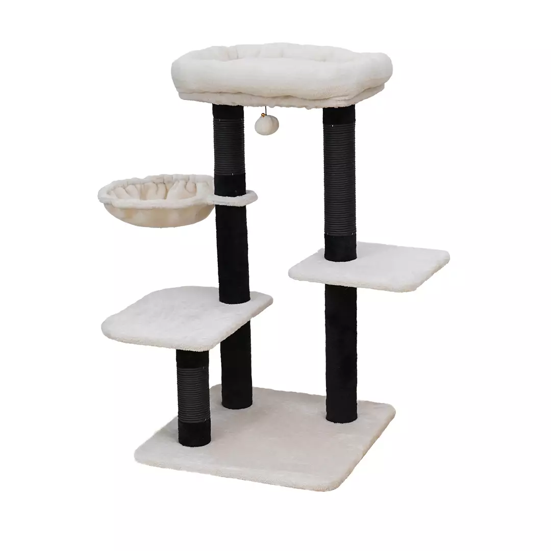 Tukeva raapimapuu riippumatolla ja mukavalla, plyyshillä päällystetyllä lepotasolla sekä kahdella tasolla.