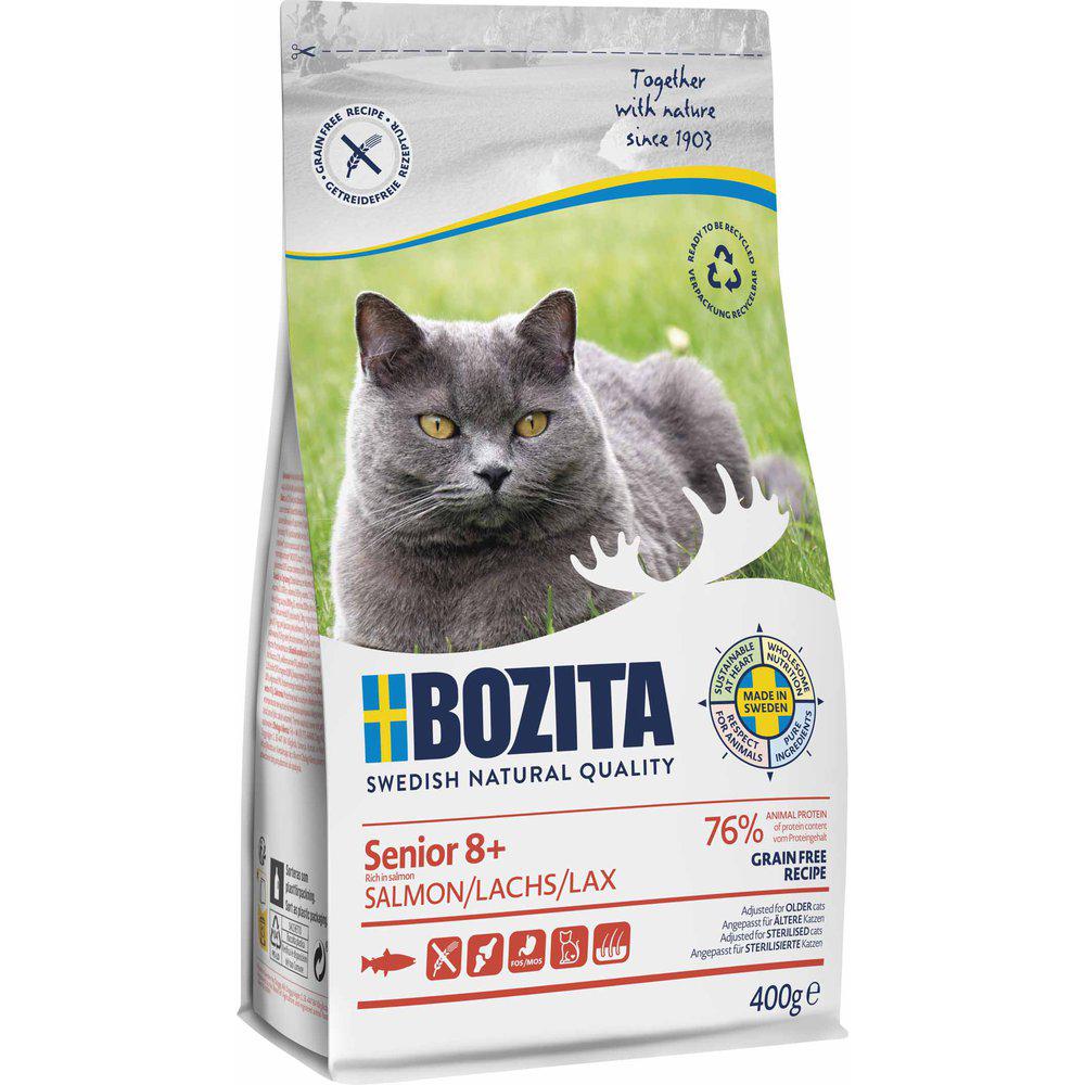 Bozita Senior 8+ Salmon on tasapainotettu täysrehu yli 8-vuotiaille kissoille. Ruoka on räätälöity ikääntyvän kissan hieman alhaisempaan ravinnontarpeeseen ja sopii siksi myös erinomaisesti steriloiduille kissoille, sekä kissoille, jotka ovat taipuvaisia ylipainoon.