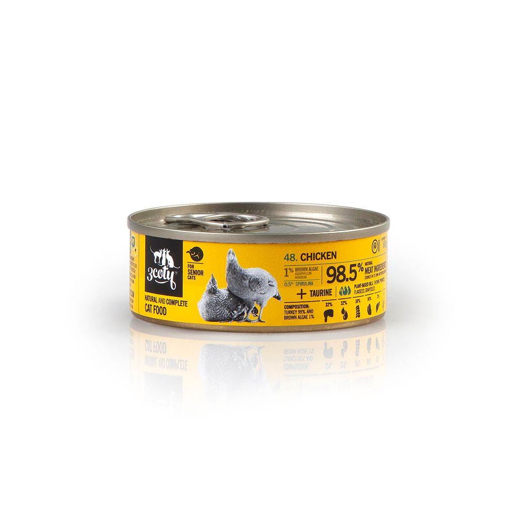 Tämä vaahtomuotoinen luonnollinen märkäruoka ei vaadi pureskelua, ja se mahdollistaa 100-prosenttisen liharuokavalion kissoille, jotka ovat saattaneet menettää hampaansa. 1 % ruskealevää tukee ruoansulatuskanavaa ja ehkäisee ummetusta, joka on yleinen ongelma vanhemmilla kissoilla. Lisäys 0,5 % spirulinaa antaa immuunijärjestelmälle vahvistusta, joka auttaa iäkkäitä kissoja torjumaan sairauksia.