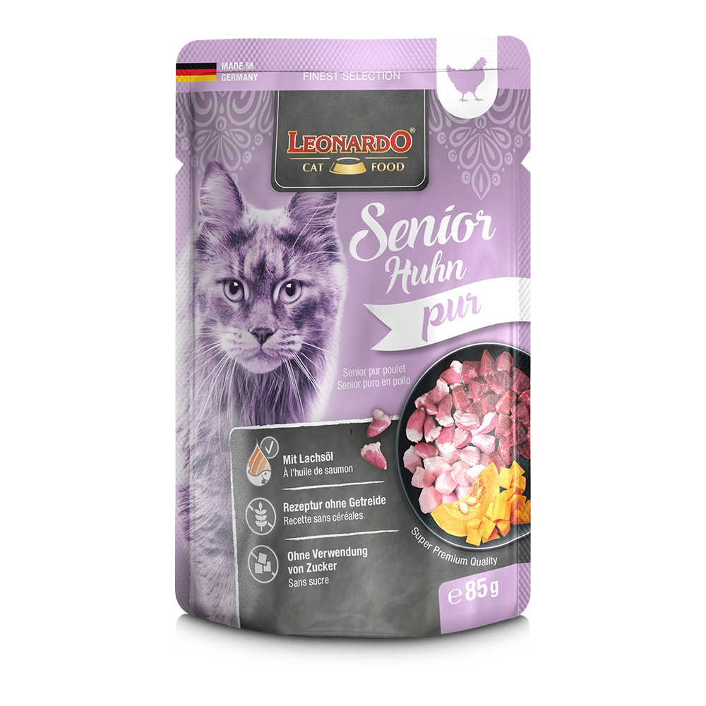 Leonardo 85g Senior kana kestosuosikki, vatsaystävällinen kana annosateria ikääntyville kissoille.