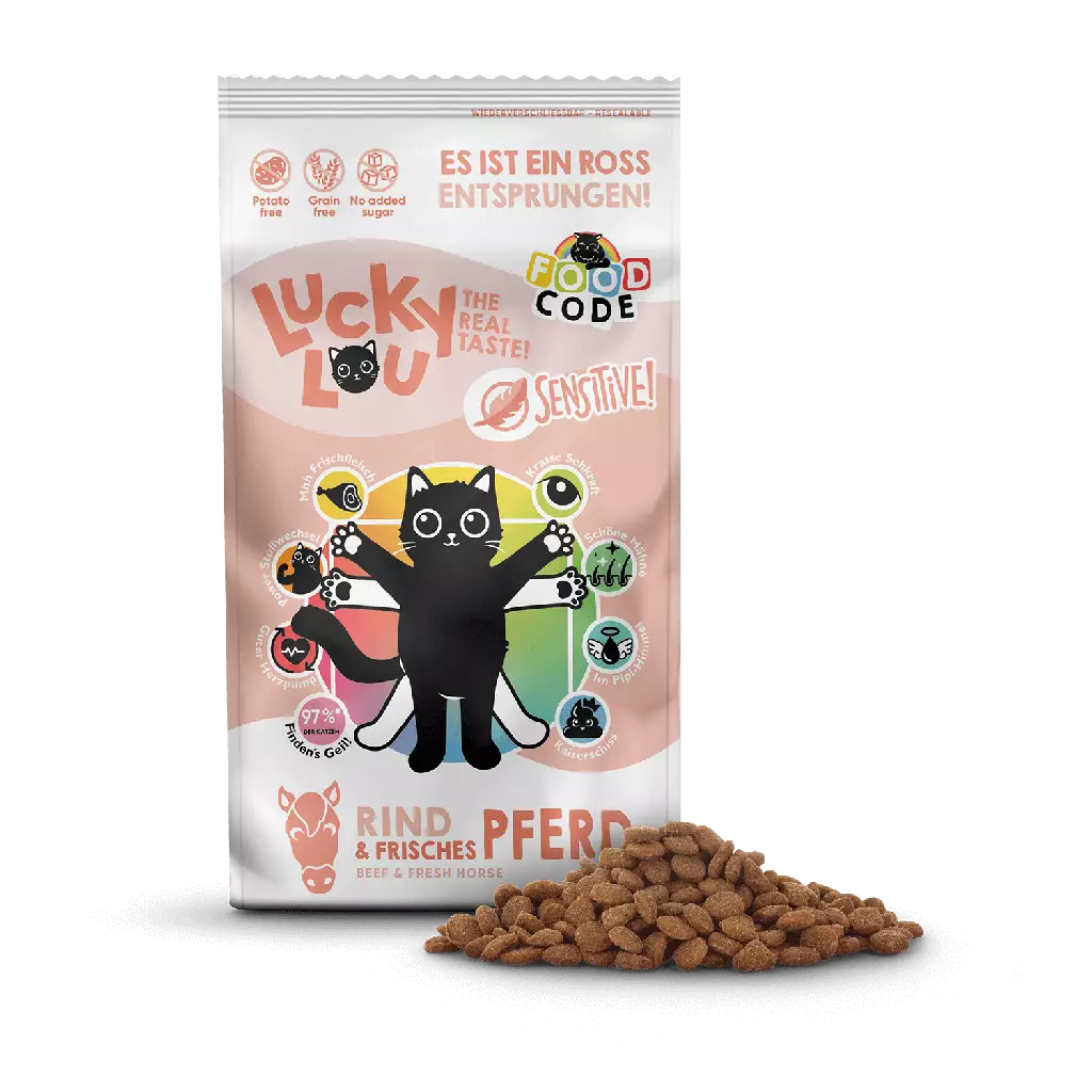 Lucky Lou Sensitive Beef & Horse Dryfood 750g herkkullinen kuivaruoka aikuisille kissoille sisältäen nautaa ja hevosta.
