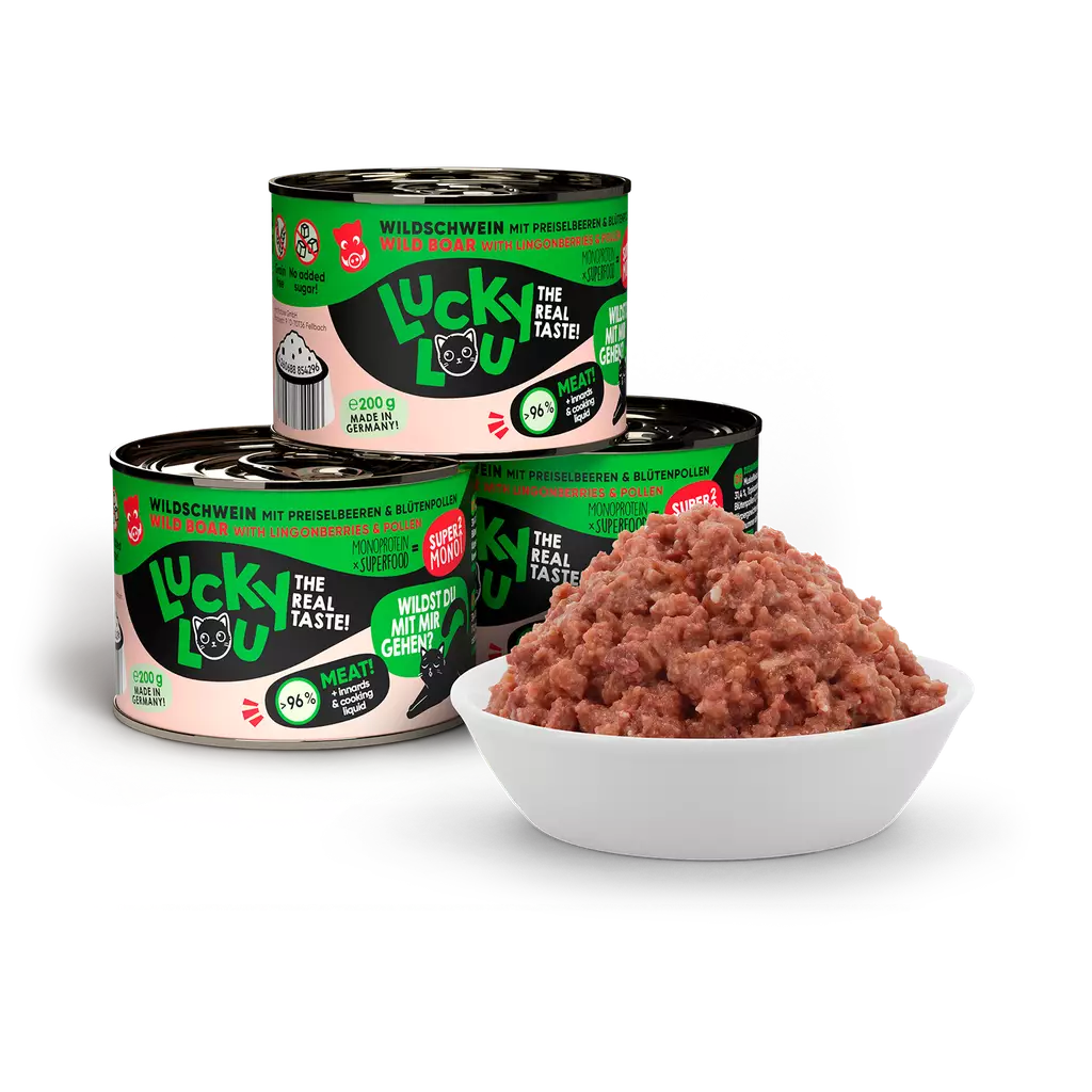 Lucky Lou SuperMono on Saksassa valmistettu täysiravinto kissoille, ainoana proteiinina villisika, mukana myös karpaloa.
