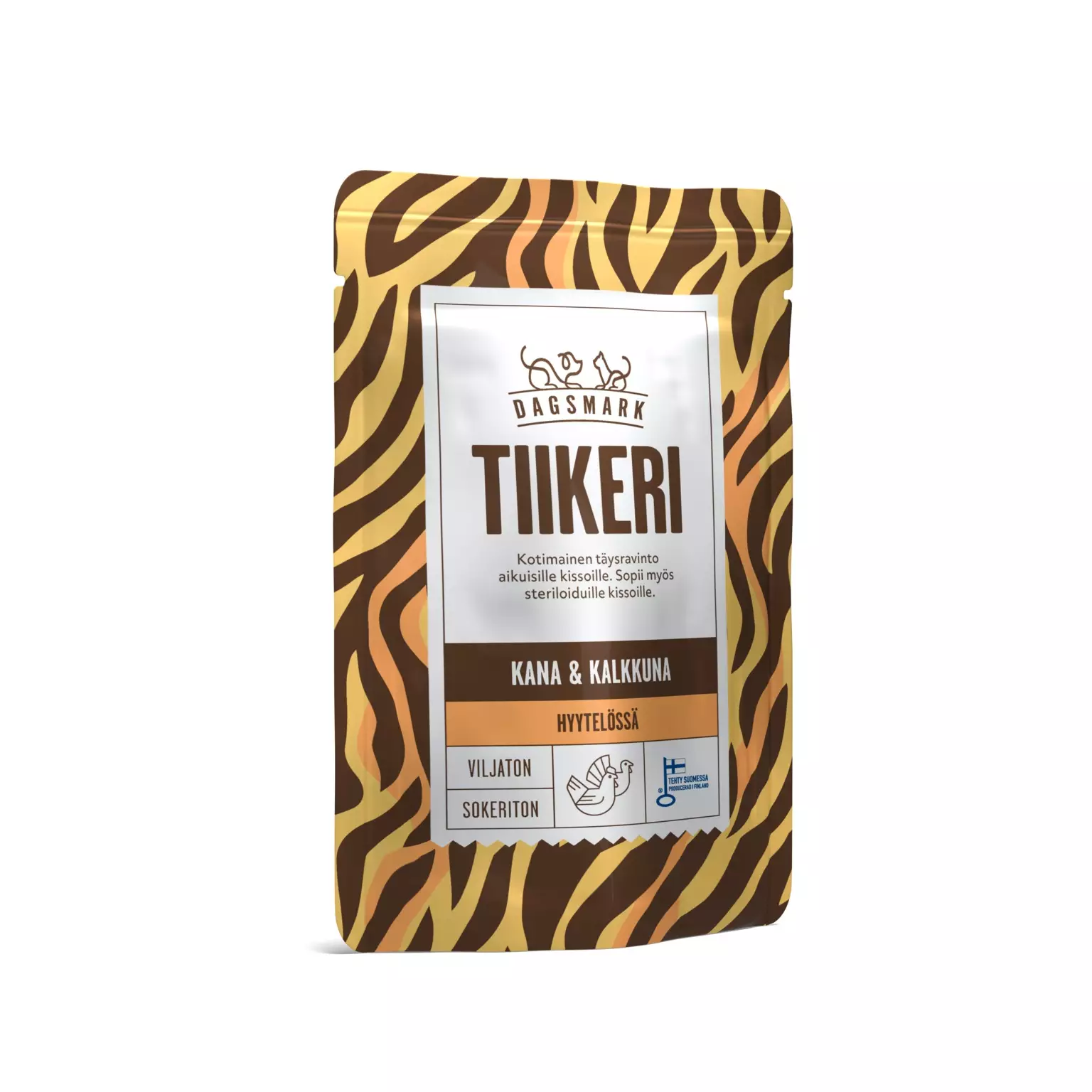 Dagsmarkin TIIKERI- hyytelössä on maukas ja proteiinipitoinen kotimaista kanaa ja kalkkunaa sisältävä viljaton koostumus.