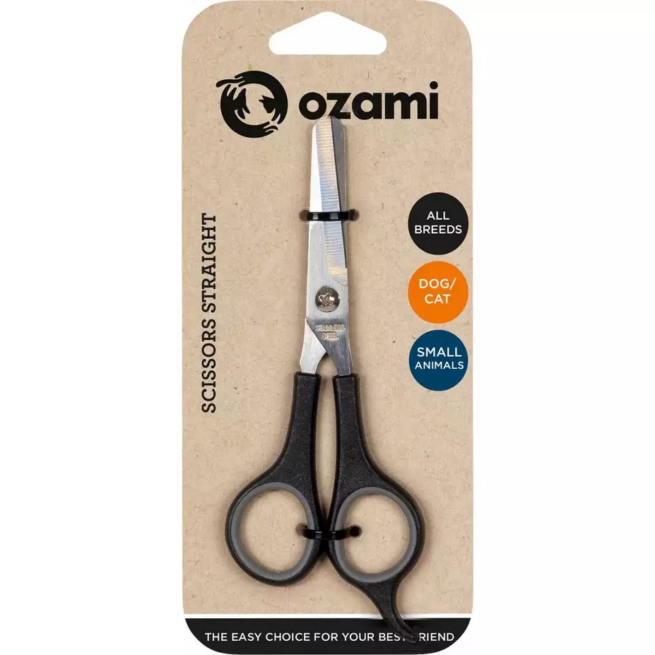 Ozami Scissor Straight on suorat trimmaussakset, suunniteltu koirille, kissoille ja pieneläimille. 14,5 cm pituiset sakset sopii erinomaisesti tarkkaan trimmaamiseen tassujen ympärillä, kasvoissa ja muilla herkällä alueilla. Ruostumattomasta teräksestä valmistetut terät takaavat siistin leikkauksen, ja ergonomiset muovikahvat lisäävät käyttömukavuutta. Sopii kaikille roduille ja lemmikeille, jotka tarvitsevat säännöllistä turkinhoitoa.