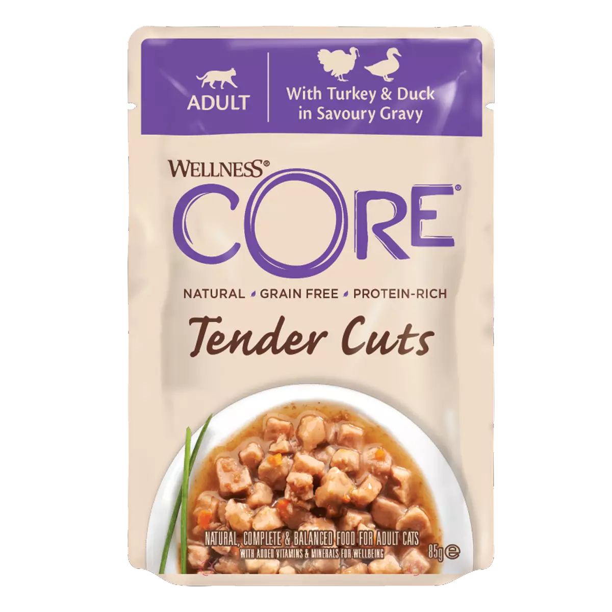 Wellness CORE Tender Cuts Recipes ovat viljattomia luonnollisia hitaasti kypsennettyjä siipikarjan tai merenelävien suupaloja yhdistettynä terveellisiin kasviksiin ja hedelmiin, kuten porkkanat, valkoinen bataatti, karpalo ja mustikka ja ne tarjoillaan herkullisessa kastikkeessa, joka aikaansaa vastustamattoman maun.