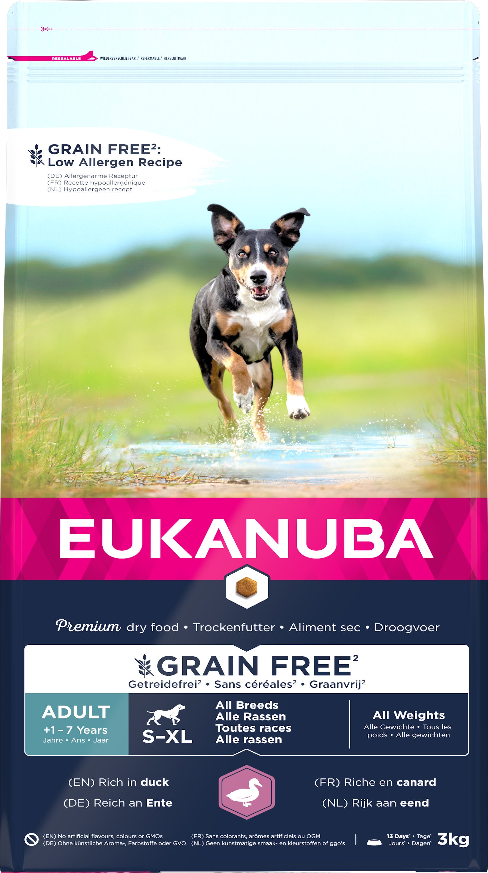 EUKANUBA Grain Free on runsaasti tuoreena pakastettua ankkaa sisältävä viljaton* ruoka kaikkien rotujen aikuisille koirille. Tukee kiinteitä lihaksia. Resepti sisältää antioksidantteja ja vitamiineja, jotka auttavat pitämään vastustuskyvyn kunnossa, sekä gluteenitonta (Valmistettu tehtaassa, jossa käsitellään viljoja.) bataattia, joka tarjoaa luonnollisen kuidun ja kivennäisaineiden lähteen. Juurikasmassa ja prebioottinen FOS tukevat tervettä ruoansulatusta ja räätälöity kalsiumtaso pitää luut vahvoina. Lisäksi luonnolliset omega-3- ja omega-6-rasvahapot pitävät ihon terveenä ja turkin kiiltävänä.