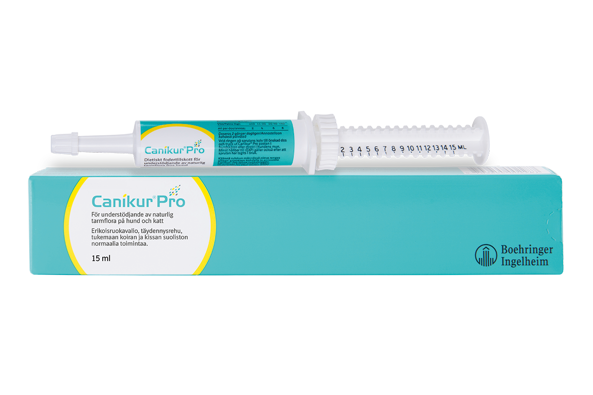 Käyttöaihe: Canikur® Pro koiralle ja kissalle ruoansulatuskanavan häiriötiloihin. Canikur Pro tahna ylläpitää ja vahvistaa suoliston normaalia mikrobistoa ja estää haitallisten bakteerien kiinnittymistä suolen pintaan. Sopii käytettäväksi esimerkiksi antibioottihoidon yhteydessä.