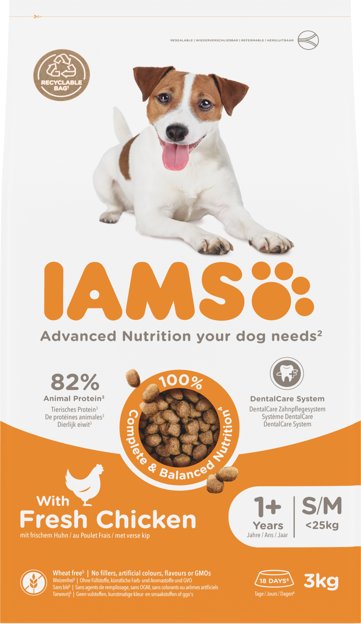 "IAMS Advanced Nutrition koirien kuivaruoka – sisältää tuoretta kanaa – yli 1 vuoden ikäisille pienten ja keskikokoisten rotujen koirille" -ruoka sisältää DentalCare-järjestelmän, joka ylläpitää hampaiden terveyttä ja vähentää hammaskiven muodostumista. Lisäksi E-vitamiinilla rikastettu antioksidanttisekoitus tukee aikuisten koirien immuunijärjestelmää vahvistaen niiden yleistä terveyttä ja vastustuskykyä.