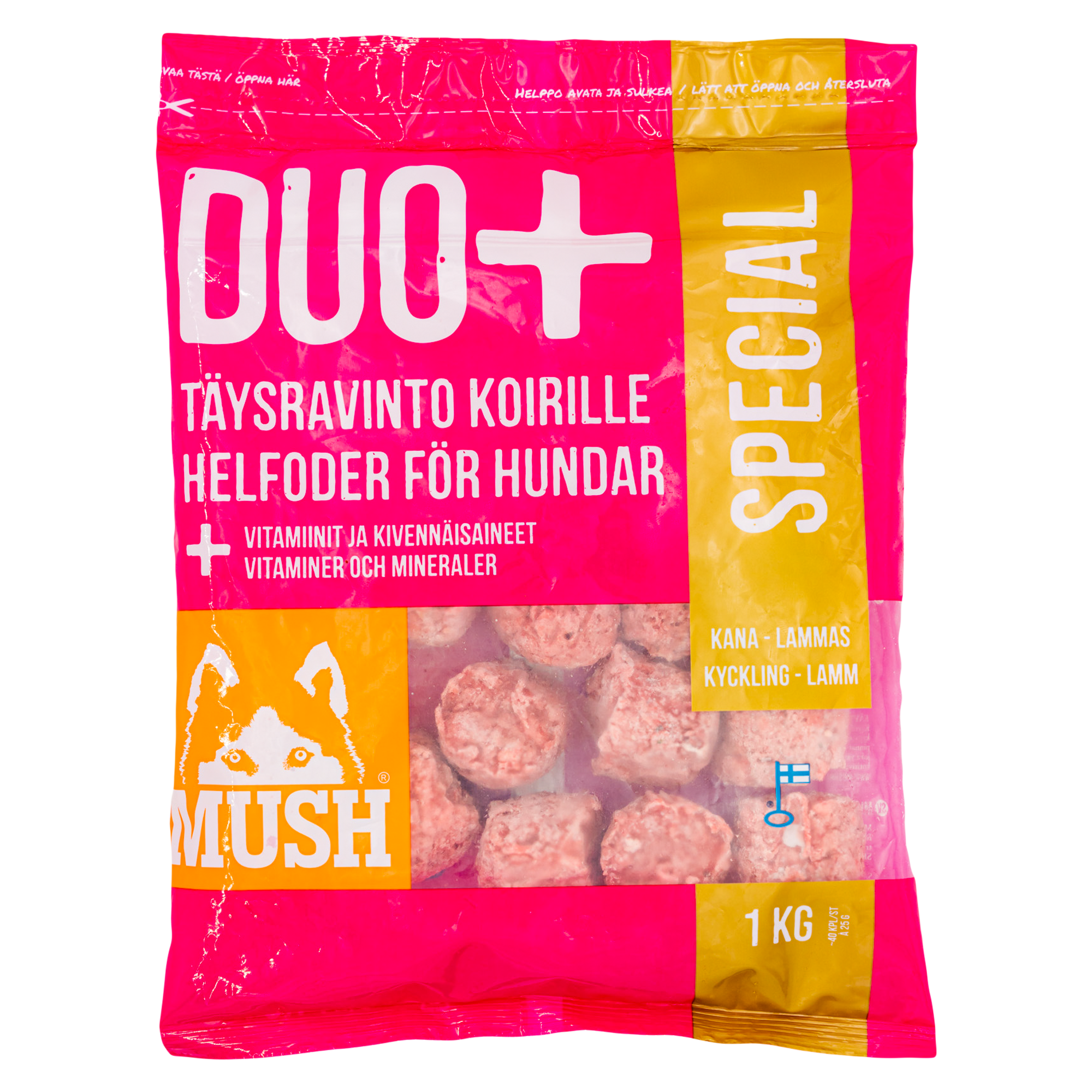 MUSH DUO+ ® Special on pakattu 1kg suuruiseen, uudelleensuljettavaan pussiin, josta on helppo ottaa tarvittava määrä ruokaa kerrallaan pakkasesta sulamaan.
