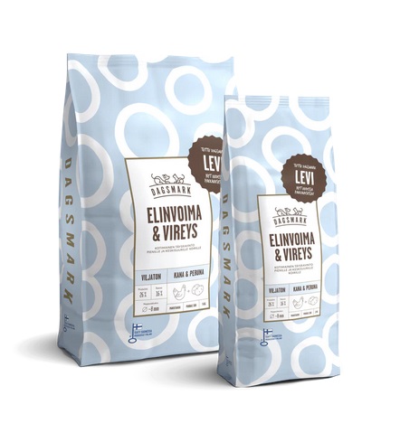 Dagsmark ELINVOIMA & VIREYS viljaton kana on kotimaista kanaa ja perunaa sisältävä kuivaruoka. Merileväöljy on hyvä omega-3- ja -6-rasvahappojen lähde, jotka ravitsevat koiran turkkia ja ihoa. Pienempi maistuva nappula takaa riittävän energian saannin nirsoimmillekin koirille.