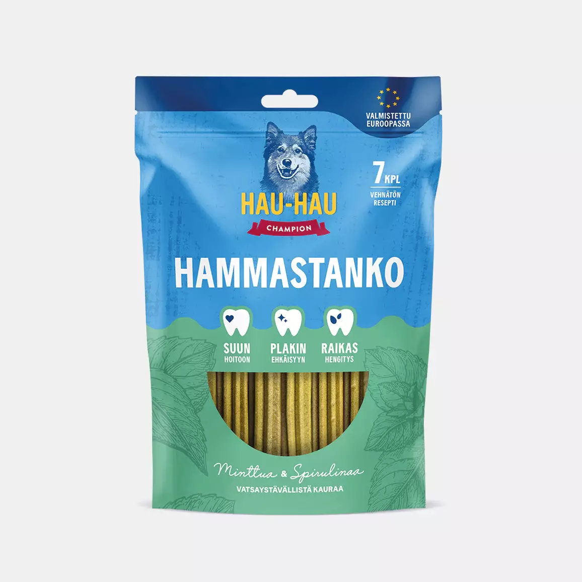 Hammastankoon on lisätty ripaus koiran hengitystä raikastavaa minttua ja spirulinaa, jotka antavat herkulle vihreän värin ilman keinotekoisia väriaineita. Hammastanko on täysin vehnätön ja gluteeniton.