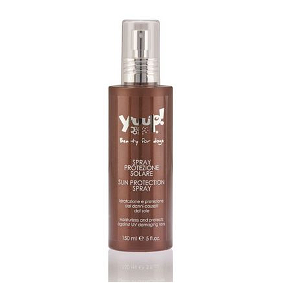 Yuup! Sun Protection Spray HOME -sarjan kosteuttava, auringolta suojaava hoitosuihke. Auttaa ehkäisemään UVA- ja UVB-säteilyn sekä infrapunavalon turkille aiheuttamaa värien haalistumista. Sisältää meriheinästä ja aprikoosista uutettuja ainesosia luomaan luonnollista suojaa auringon vaikutusta vastaan. Keratiini ja vitamiinit ravitsevat karvaa.