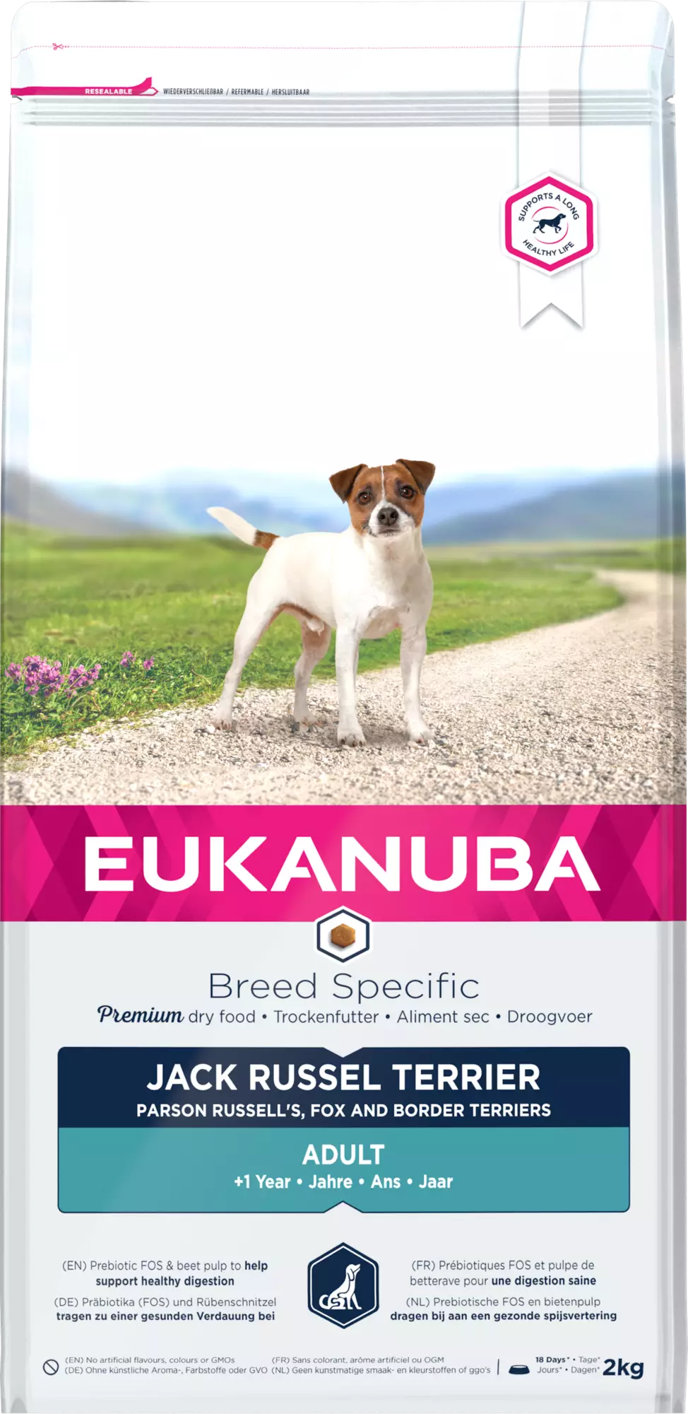 Eukanuban aikuisille Jack Russell Terriereille tarkoitettu kuivaruoka, joka sopii myös Parson Russell -terriereille, kettuterriereille ja borderterriereille, edistää ruoansulatuskanavan terveyttä ja ravintoaineiden optimaalista imeytymistä prebioottien ja sokerijuurikasmassan ansiosta. Tämä rotukohtainen ravinto sisältää räätälöidyn määrän L-karnitiinia, joka auttaa luonnollisesti polttamaan rasvaa. Ruoka sisältää myös omega-6- ja omega-3-rasvahappoja, jotka tukevat tervettä ihoa ja kiiltävää turkkia. Lisäksi eläinperäiset proteiinit auttavat ylläpitämään vahvoja ja hoikkia lihaksia.