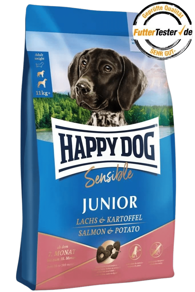 Suosittelemme Sensible Junior Lachs&Kartoffelia 7.–18. elinkuukaudelle. Sen jälkeen juniori on täysikasvuinen: vasta sitten on aika siirtyä ns. aikuisten koirien ruokaan. Esimerkiksi Happy Dog Sensible -sarjassamme on useita vaihtoehtoja.