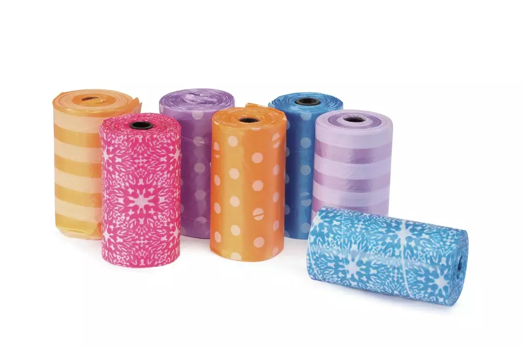 Värikkäitä kakkapusseja irtorullina. Yksittäisessä rullassa 20kpl pusseja.