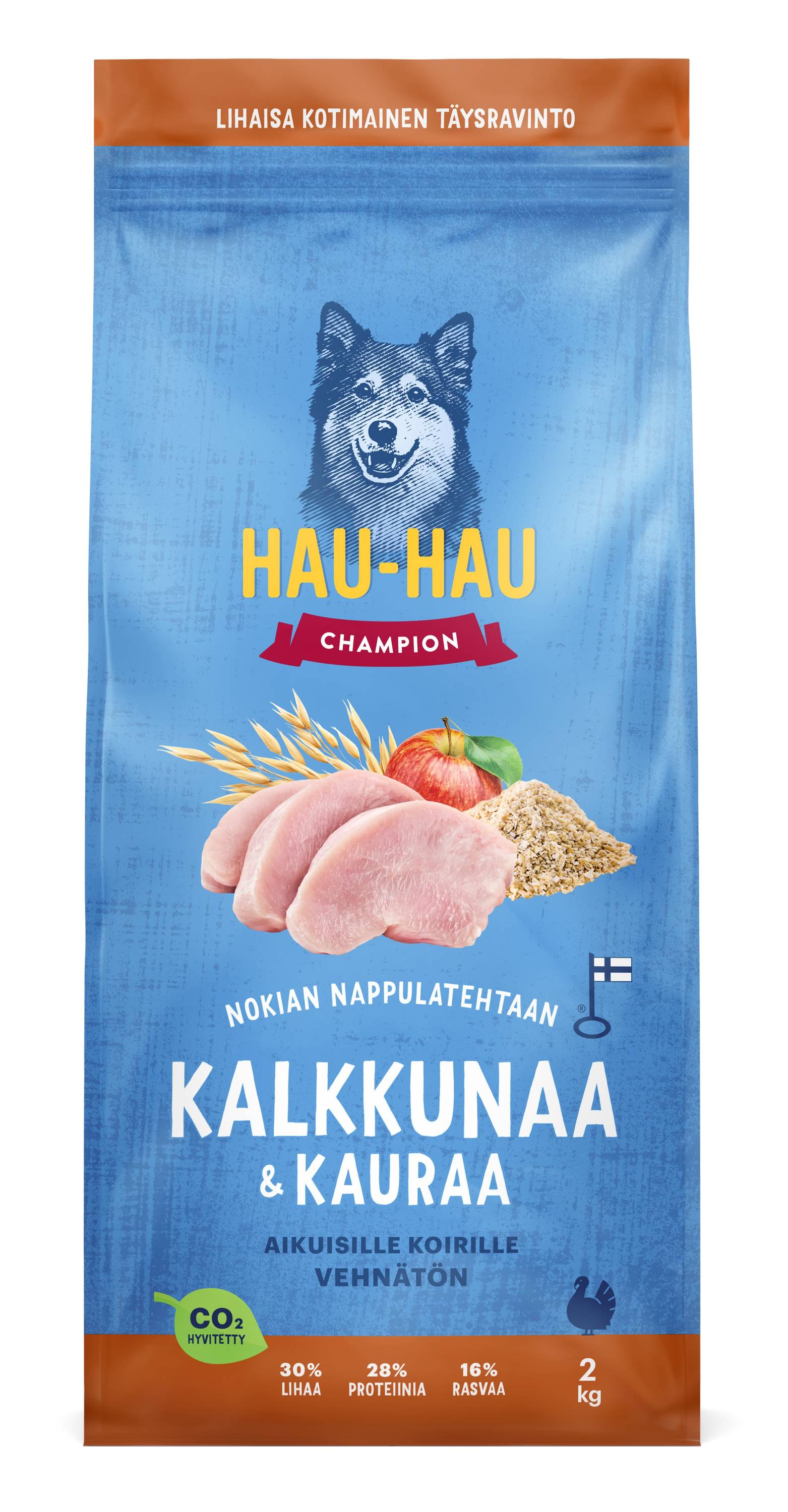 Hau-Hau Champion Kalkkunaa & kauraa on vehnätön koiran kuivaruoka, joka on valmistettu Hau-Haun omalla Nokian nappulatehtaalla Pirkanmaalla. Maistuva ja lihaisa täysravinto sisältää 30 % kalkkunanlihaa ja kaikkiaan 28 % proteiinia, josta 70 % on eläinperäistä. Helposti sulava, proteiinipitoinen kalkkunanliha on 100 % kotimaista ja sopii hyvin herkkävatsaisillekin koirille.