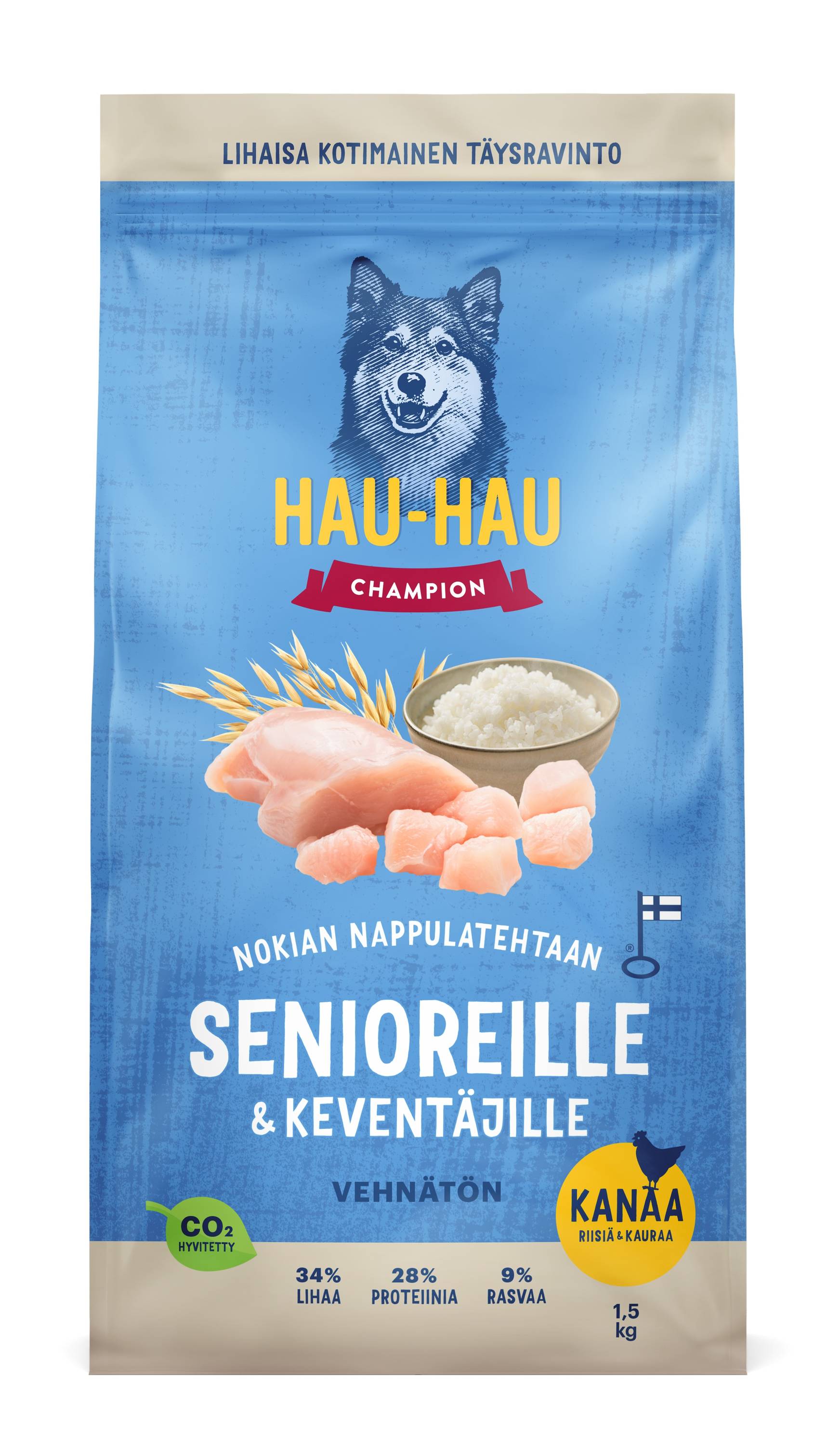 Kotimainen Hau-Hau Champion Kanaa, riisiä & kauraa senioreille ja keventäjille on täyttävä, mutta vähärasvainen koiran kuivaruoka.
