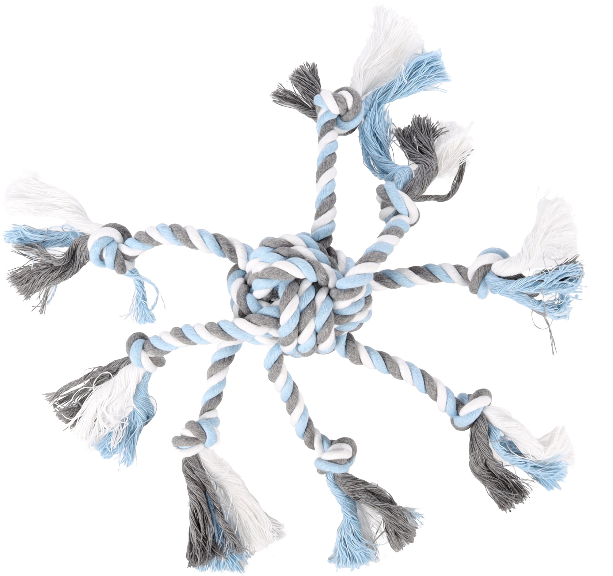 Koiran köysilelu, 8 sakarainen mustekalapallo. Puuvillainen materiaali puhdistaa leikkiessä koiran hampaita ja ikeniä. Neljä eri kokoa.