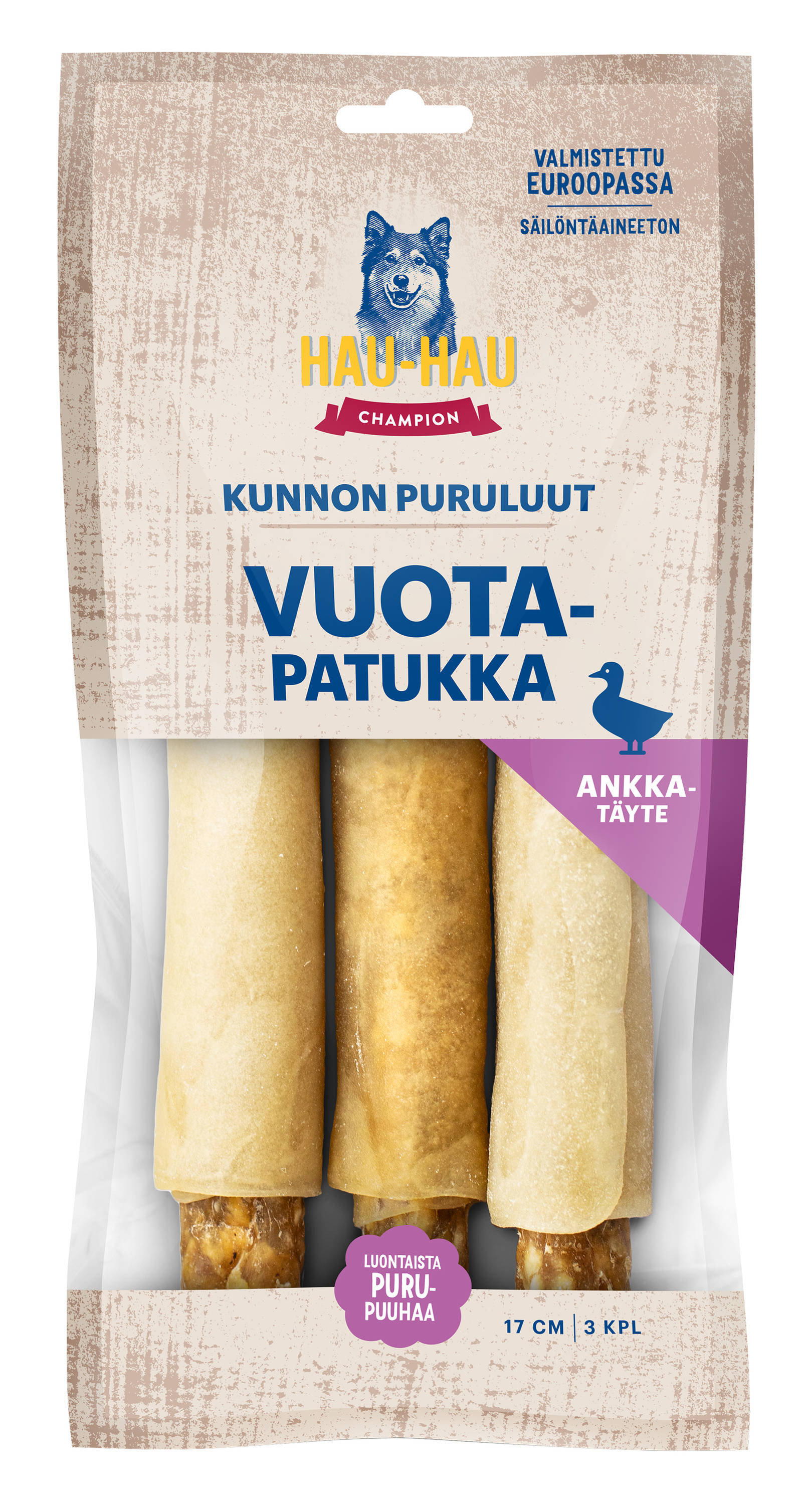 Tarjoa koirallesi lajityypillistä puuhaa Hau-Hau Championin Kunnon puruluut -sarjalla. Vuotapatukka ankka on herkullinen puruluu, jonka sitkeän naudannahkakuoren alle on kätketty ankkaa sisältävä rouhetanko. Kestävänä puruluuna Vuotapatukka antaa koiralle lajityypillistä puuhaa pitkäksikin aikaa. Puruluun kaluaminen tukee myös koiran suun terveyttä, sillä se auttaa puhdistamaan mekaanisesti koiran hampaita ja ikeniä. Täysin viljaton, vähärasvainen ja säilöntäaineeton Vuotapatukka sisältää runsaasti proteiinia. Puruluun houkutteleva tuoksu ja herkullinen maku voivat saada nirsonkin koiran viihtymään pureskelun parissa.