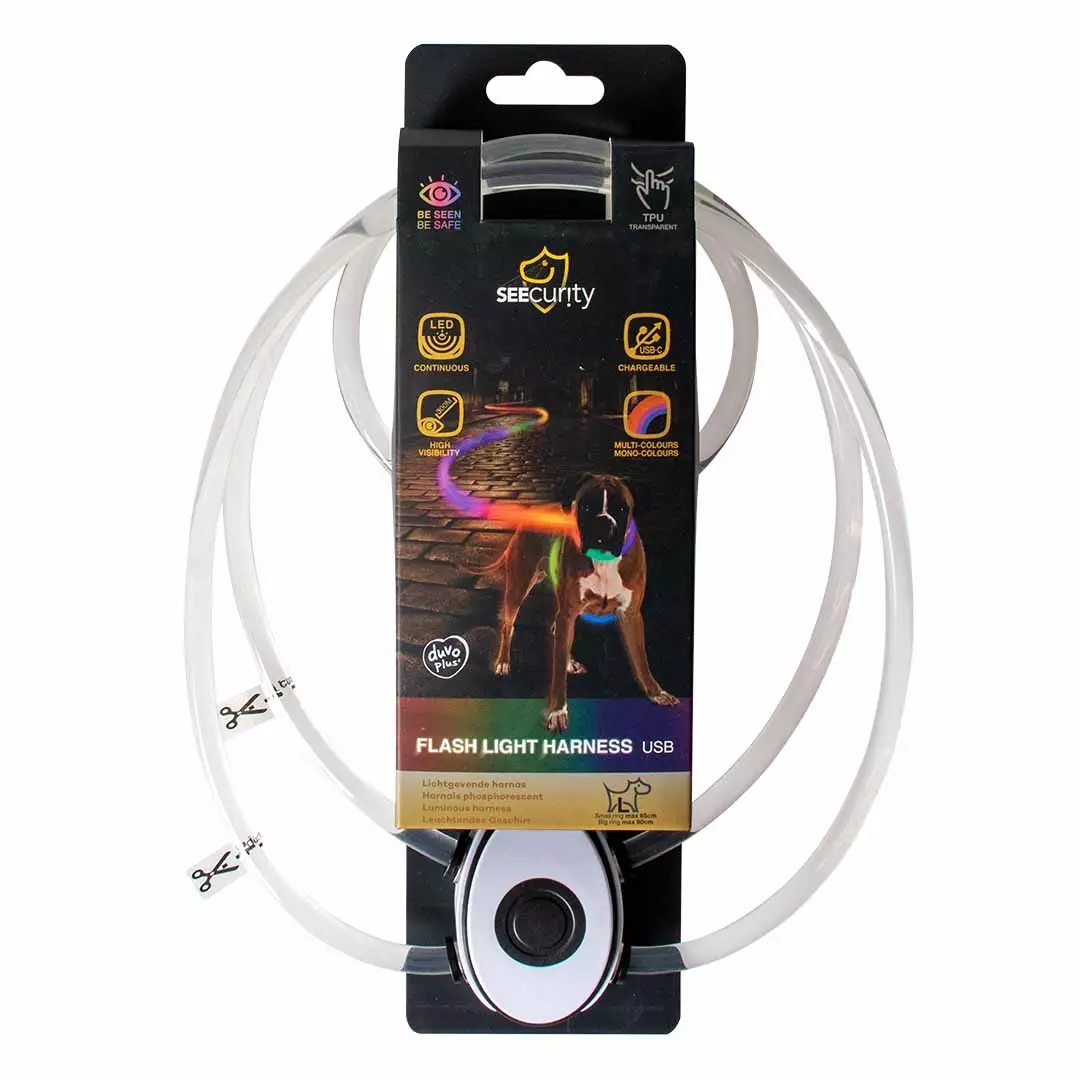 Näkyvyys ja turvallisuus ovat kaksi keskeistä tekijää duvoplusin SEEcurity-sarjassa. Näissä värikkäissä LED-valolla varustetuissa pannoissa ja valjaissa on erinomainen näkyvyys pimeässä, mikä takaa turvalliset ulkoiluhetket koirasi kanssa. Ne ovat helppokäyttöisiä, säädettävissä koirasi koon mukaan ja ladattavissa kätevästi USB:n kautta. Tämä läpinäkyvä TPU-valjas on täysin monivärinen ja tuottaa jatkuvan valon, joka saa koirasi erottumaan edukseen!