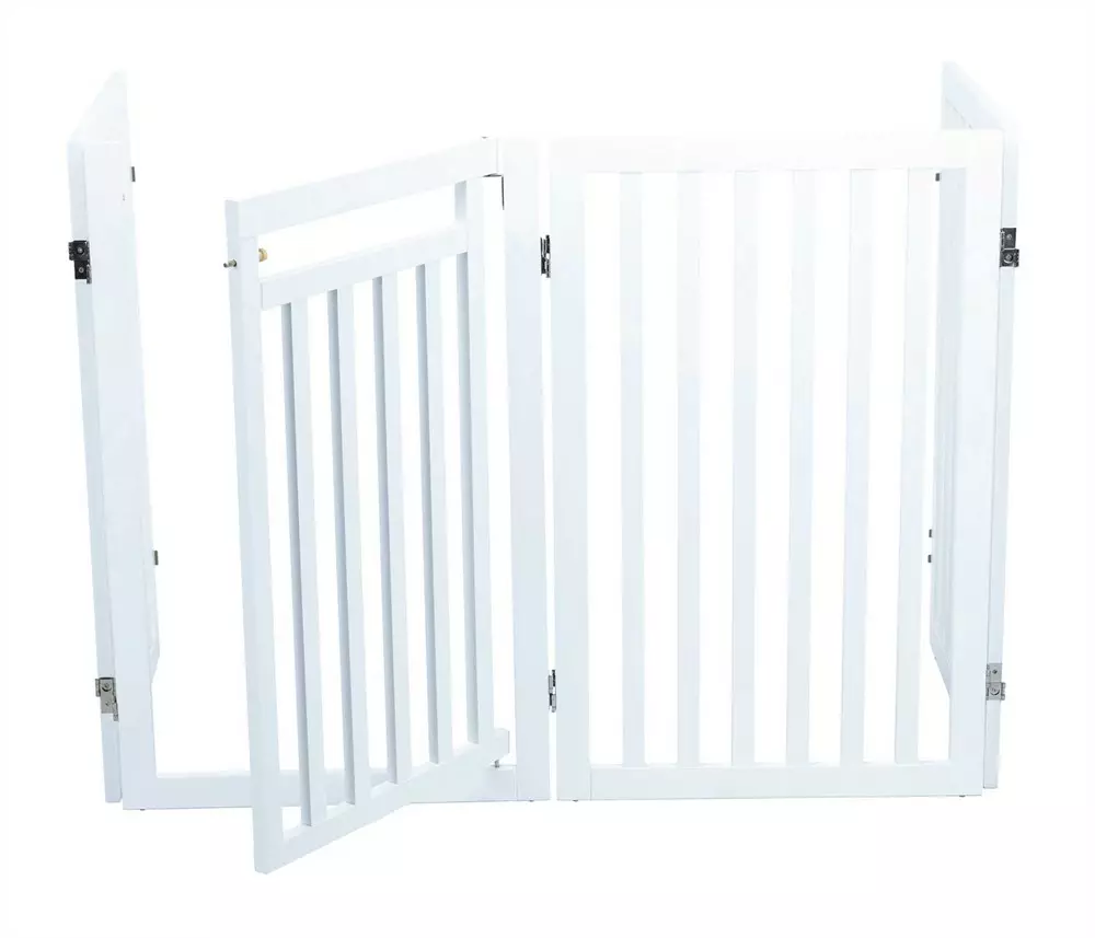 Käytännöllinen ja tyylikäs koiraportti auttaa rajaamaan lemmikin liikkumista kodin eri tiloissa, kuten huoneissa tai portaiden läheisyydessä. Valkoinen, lakattu MDF-rakenne sopii hyvin kodin sisustukseen ja on samalla tukeva käytössä. Portissa on saranoitu ovi, jonka kautta lemmikki voi kulkea silloin kun se on sallittua. Taitettava rakenne tekee portista helpon säilyttää, sillä se vie hyvin vähän tilaa silloin kun sitä ei käytetä. Säädettävän leveyden ansiosta portti sopii monenlaisiin aukkoihin. Mukana tulevat jalat lisäävät vakautta, ja porttia voidaan tarvittaessa laajentaa yhdistämällä siihen lisää osioita.