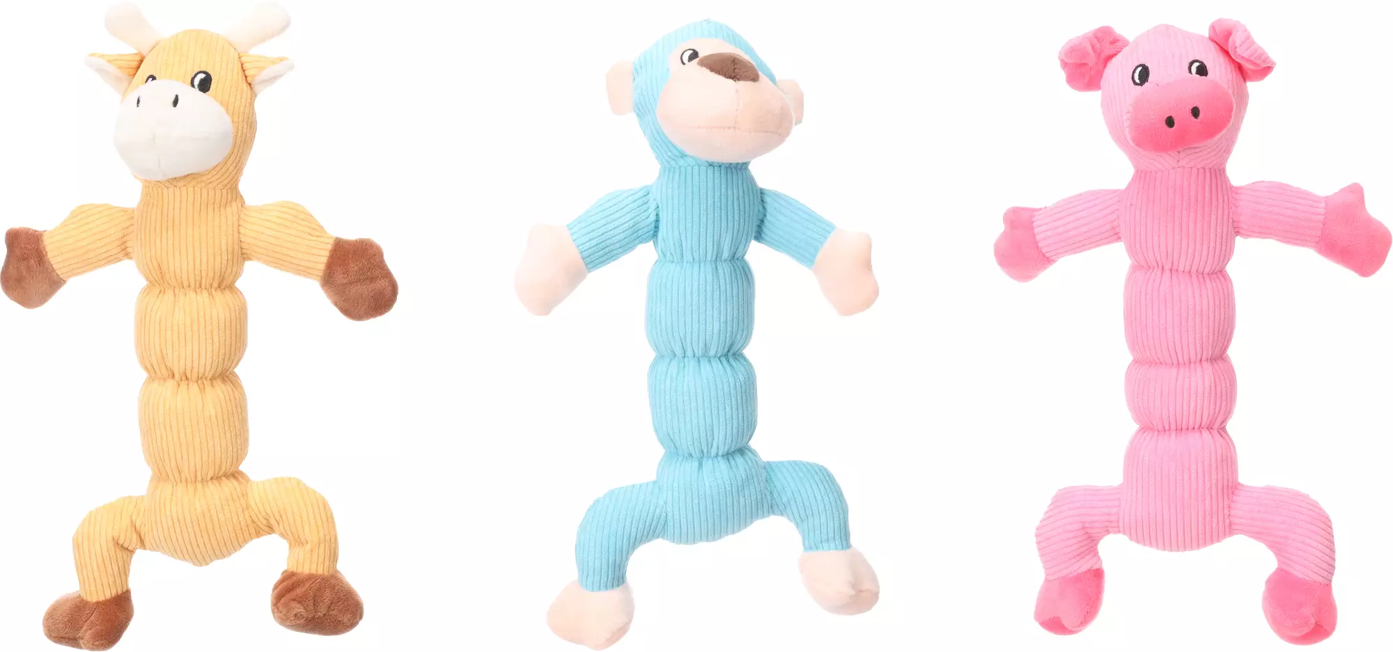 Pitkänmallinen koiran pehmolelu erilaisina eläinhahmoina. Materiaali plyyshi, viimeistely vakosametilla. Lelun sisällä on myös vinku lisäämässä mielenkiintoa leikkimiseen.