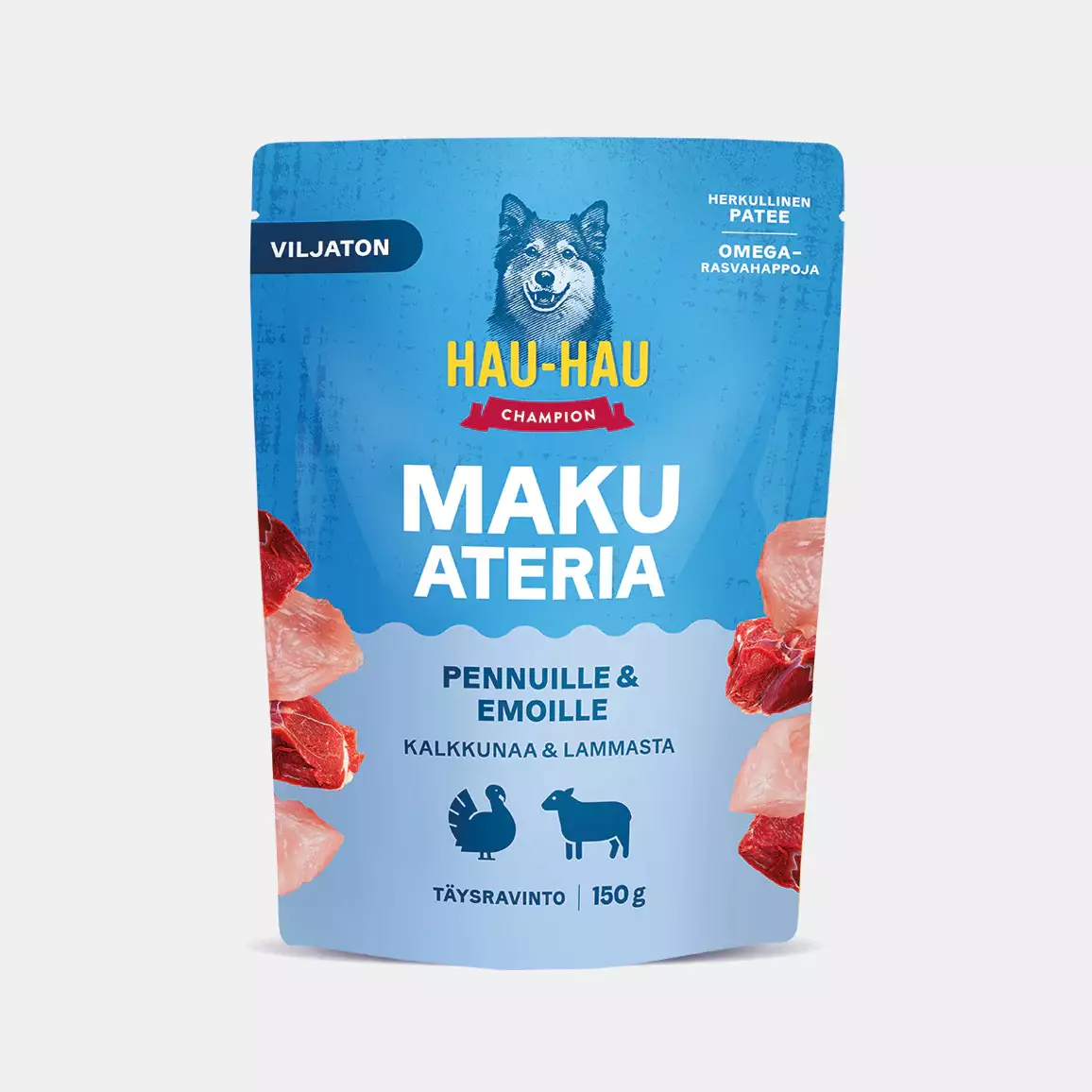 Makuateria Pennuille & Emoille viljaton kalkkuna-lammas ateria 150g Hau Hau Champion