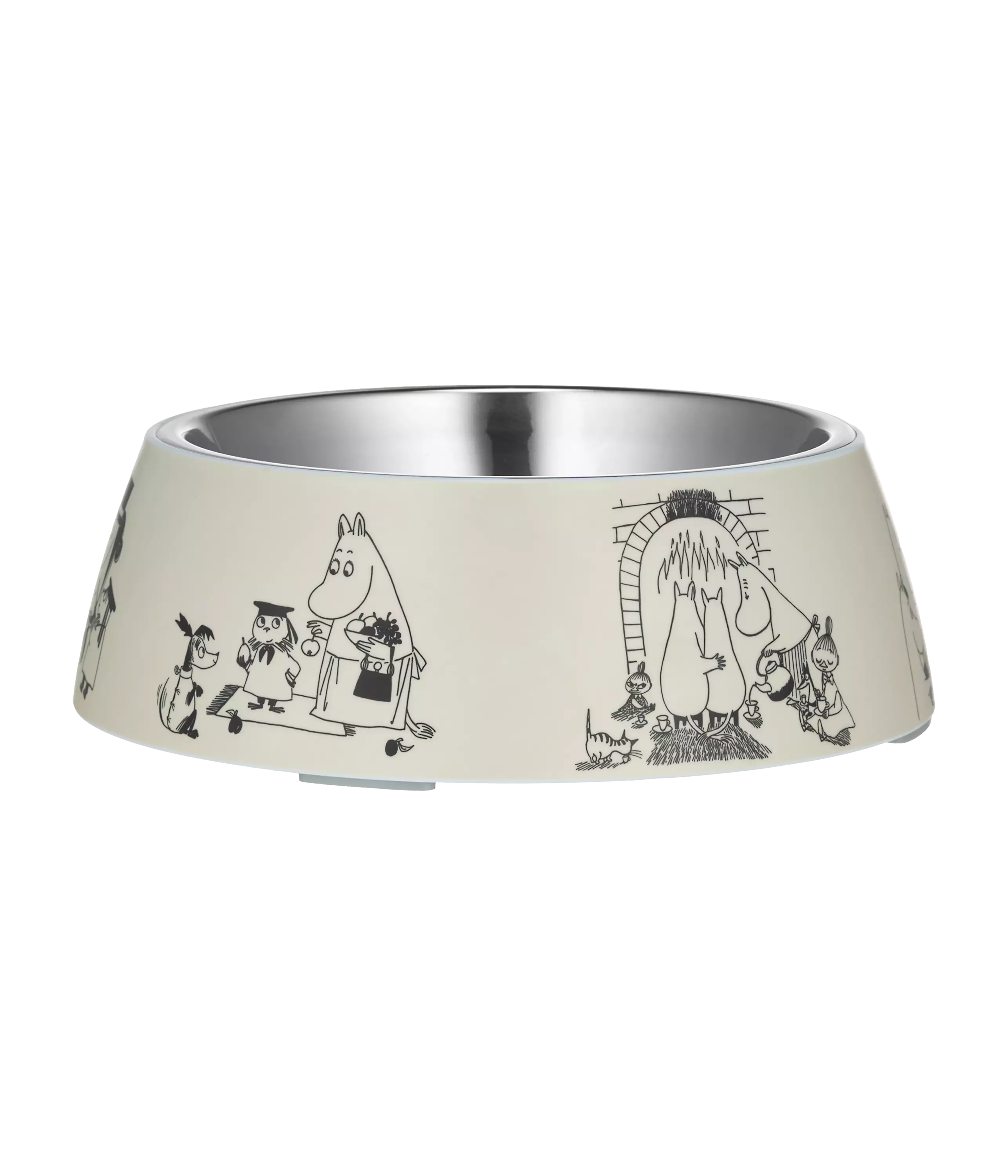Muumit Juhlavuosimalli! Kulhossa on kaksi osaa. Irrotettava sisäosa on ruostumatonta terästä ja ulko-osa melamiinia. Molemmat ovat konepesun kestäviä.