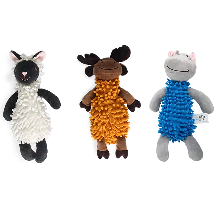 Kolme erilaista koiran pehmolelua, joiden vartalo on moppimaista materiaalia. Ilmoita tilatessasi hahmotoiveesi, valittavana kolme eläintä: lammas, lehmä tai hippo.