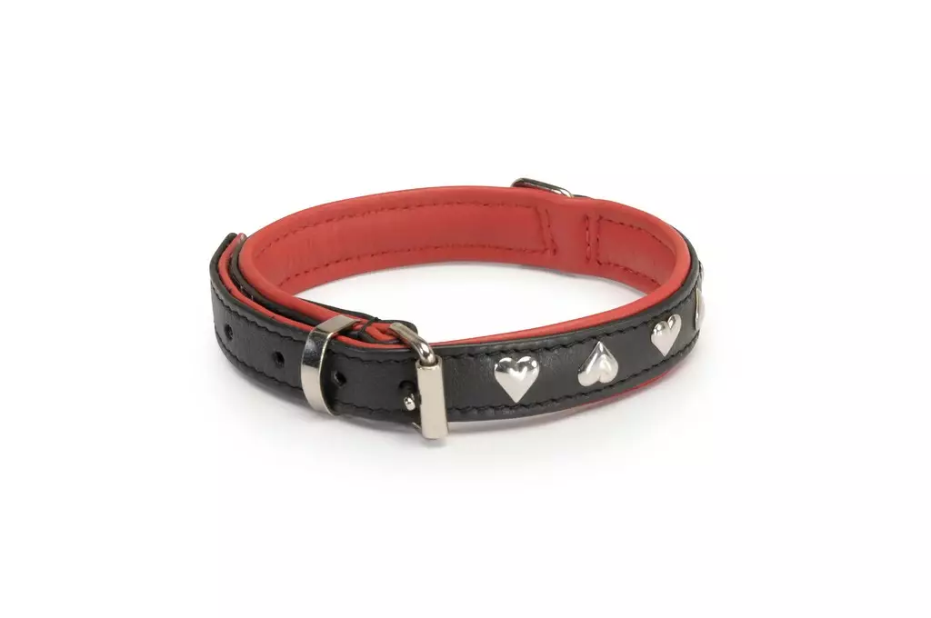 Elegantti pehmeä nahkakaulapanta, jossa metalliset sydämenmuotoiset koristeet. Saatavilla neljässä koossa.