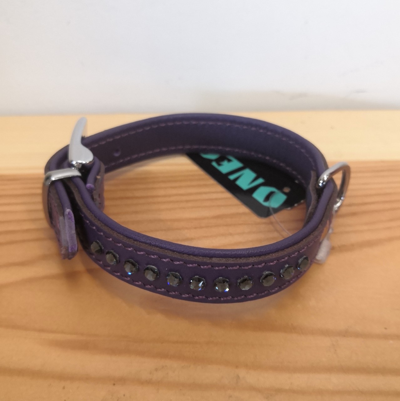 Tyylikäs liila solkipanta 100% nahkaa. Siniset strassit antavat kauniin lisäyksen muuten simppeliin pantaan. Pannan kokonaismitta on 25cm ja sen leveys on 16mm.