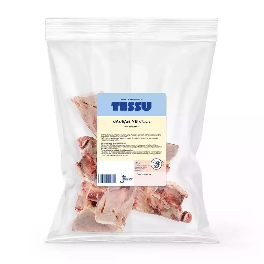 Raakapakaste uudelleensuljettavassa pussissa. Kotimainen, kokonainen naudan ydinluu sahattuna erilaisiksi paloiksi on paitsi herkullista evästä, myös erinomaista ajanvietettä koirallesi. Samalla se myös auttaa puhdistamaan koiran hampaita. Valvothan koiraa aina sen syödessä luuta sisältäviä tuotteita.