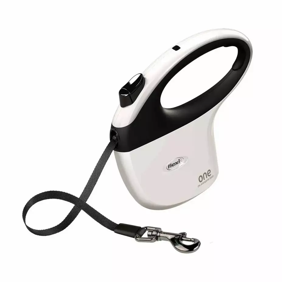 Tyylikäs musta-valkoinen kelatalutin säädettävällä kädensijalla, max 30kg painoiselle koiralle.