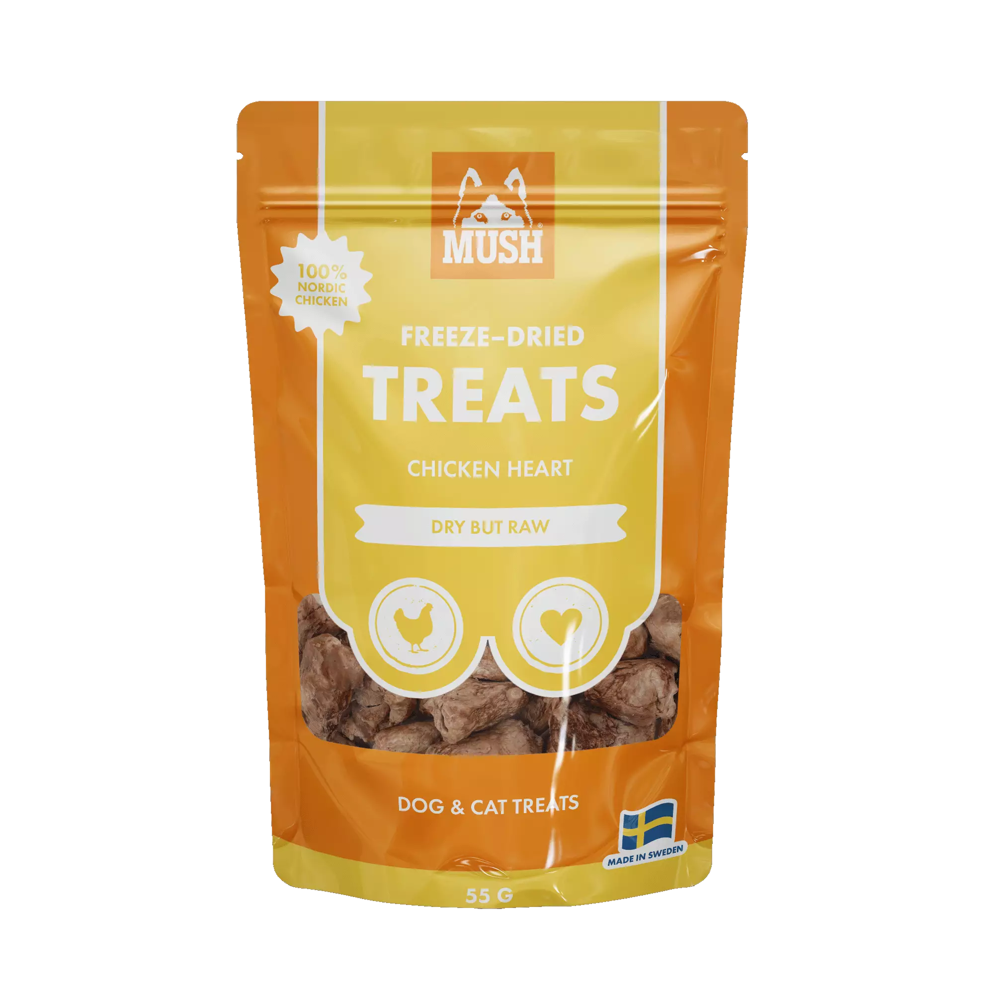 MUSH FREEZE-DRIED TREATS - sisältää kahdeksan uutta tuotetta, jotka koostuvat sian, naudan, kanan ja lampaan raaka-aineista. Tuotteet valmistetaan korkealaatuisista pohjoismaisista raaka-aineista, ilman lisäaineita, omassa tehtaassamme Nässjössä, Ruotsissa. Sarja on luonnollinen ja korkealaatuinen valinta koirille ja kissoille.