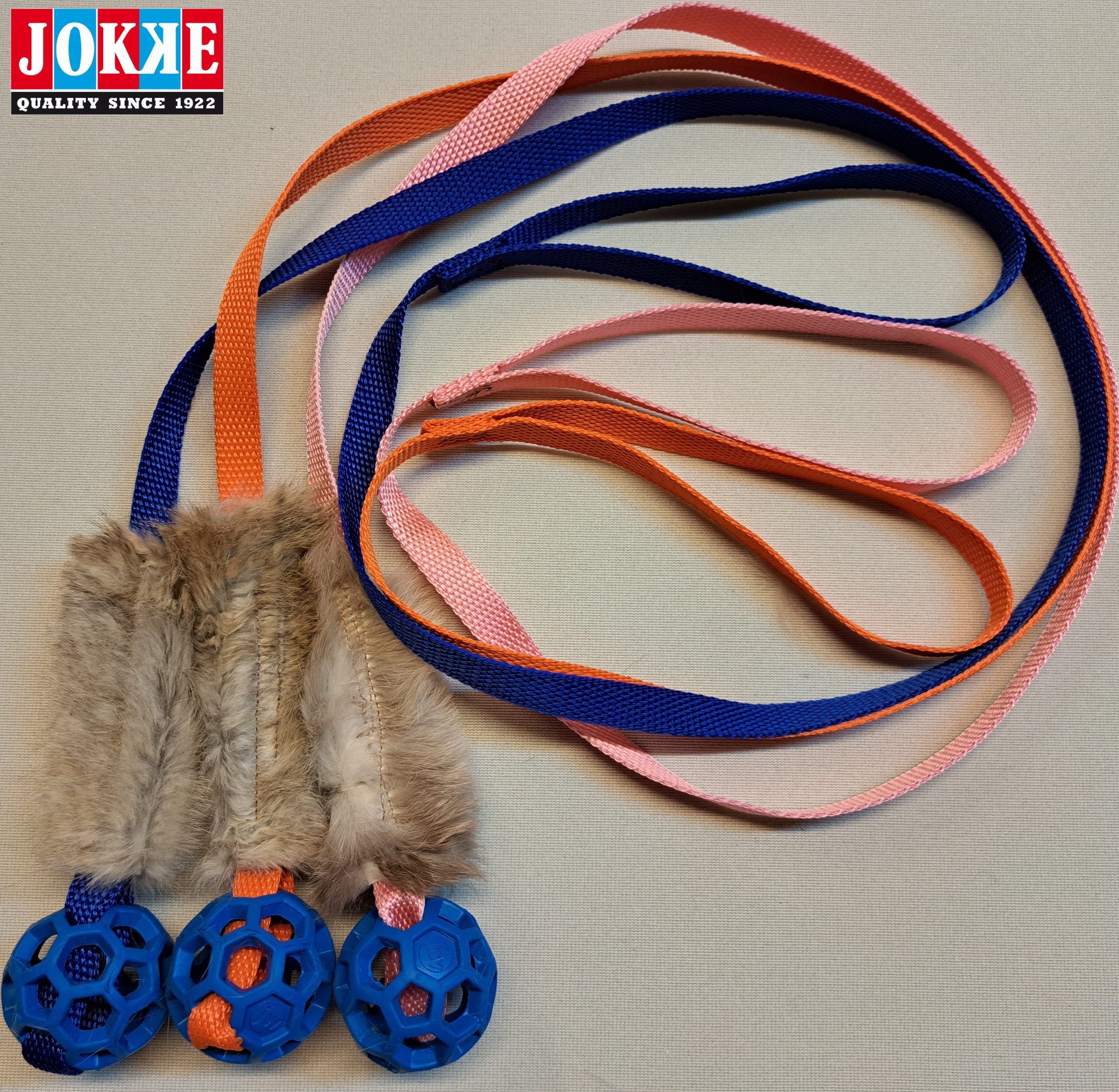 Kestävällä 5 cm läpimittaisella JW-reikäpallolla Kälviällä valmistettu motivointilelu. Tuote on 110 cm kokonaispituudeltaan, nauhan leveys 15 mm, kaninkarvaosuus 10 cm x 15 mm. Kestävyyden takaamiseksi olemme pujotelleet nauhan kulkemaan pallon läpi myös sen alapuolelta ja käyttäneet vahvaa ompelulankaa.