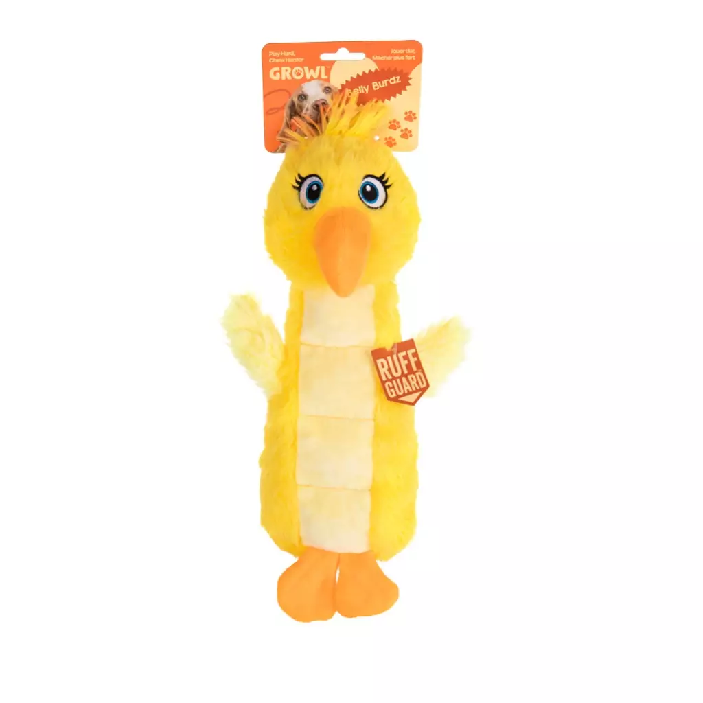 Belly Burdz -leluissa on Ruff Guard -teknologia: vahvistettu 1080D denier -materiaali ja nailonompeleet kriittisissä kohdissa varmistavat, että lelut kestävät rajua käyttöä ja innokkaita pureskelijoita.
