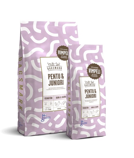 Dagsmark Pentu & Juniori tukee kasvavan pennun hyvinvointia ja sisältää kaikki pentusi tarvitsemat kivennäisaineet sekä vitamiinit. Kuivaruoka ei sisällä vehnää, soijaa, maissia eikä säilöntä-, aromi- tai väriaineita.