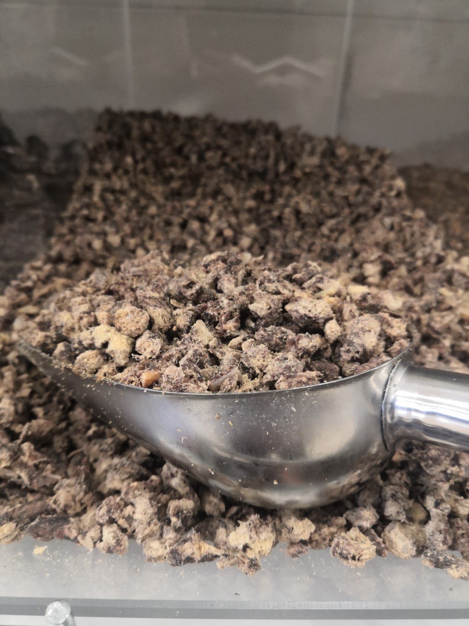 Kuivattua poron lihaa ja luuta rouheena. Herkutteluun tai vaikka ruokinnan täydentämiseen.